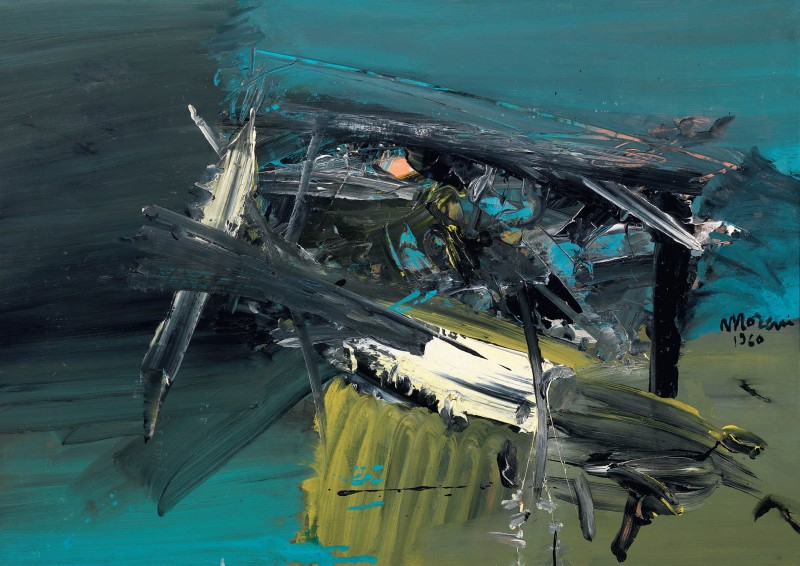 Mattia Moreni Pavia 1920 - Ravenna 1999 Piccola immagine in pericolo, 1960 Olio su tela, cm. 75x105 Firma e data sul lato destro al centro: Moreni / 1960; titolo, firma e data al verso sulla tela: Piccola immagine / in pericolo / Moulin / Rouge / Moreni / 1960. Bibliografia: Georges Mathieu, Mattia Moreni, Jean Paul Riopelle "Veemenze confrontate", catalogo della mostra a cura di Flaminio Gualdoni, Milano, Galleria Morone, 2009, pp. 20, 21.