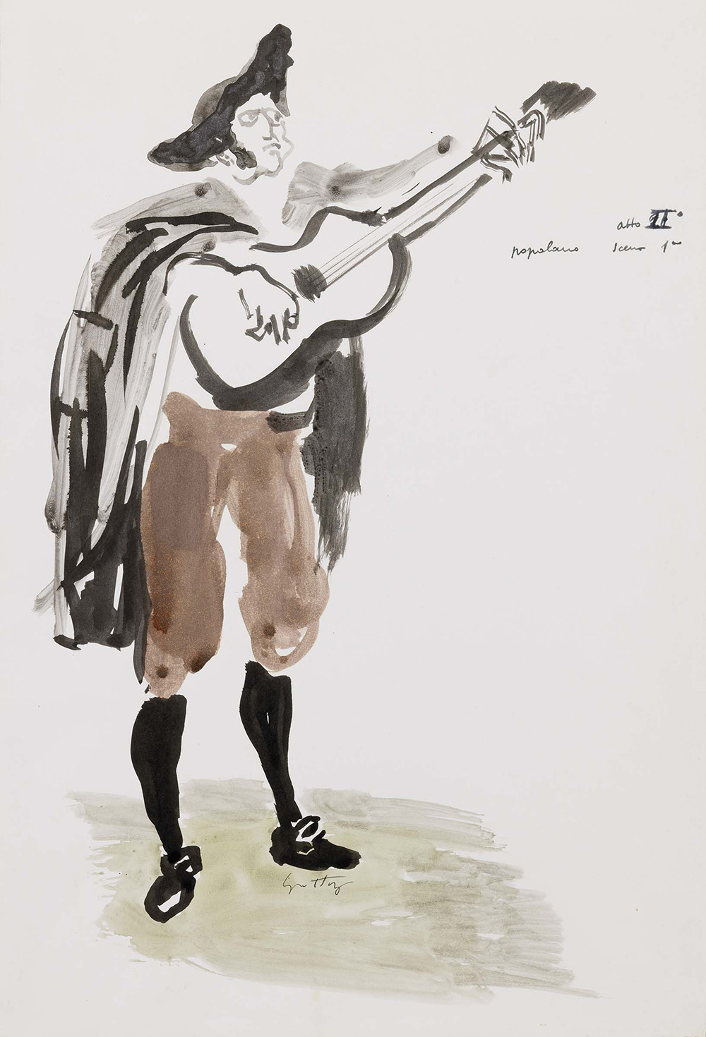 Renato Guttuso, Bagheria (Pa) 1912 - Roma 1987, Popolano, Acquerello su carta, cm 49,5x34,3, Firma in basso al centro: Guttuso, scritta sul lato destro: Atto II / Popolano Scena Iª, Storia: Collezione Marcobi; Collezione privata