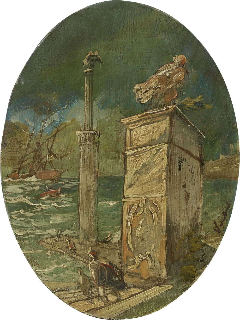 Nanni Valentini, Sant'Angelo in Vado (PU) 1932 - Vimercate (MB) 1985, Mareggiata, Olio su tavola, cm 25,5x19, ovale, Firma a destra: Valentini