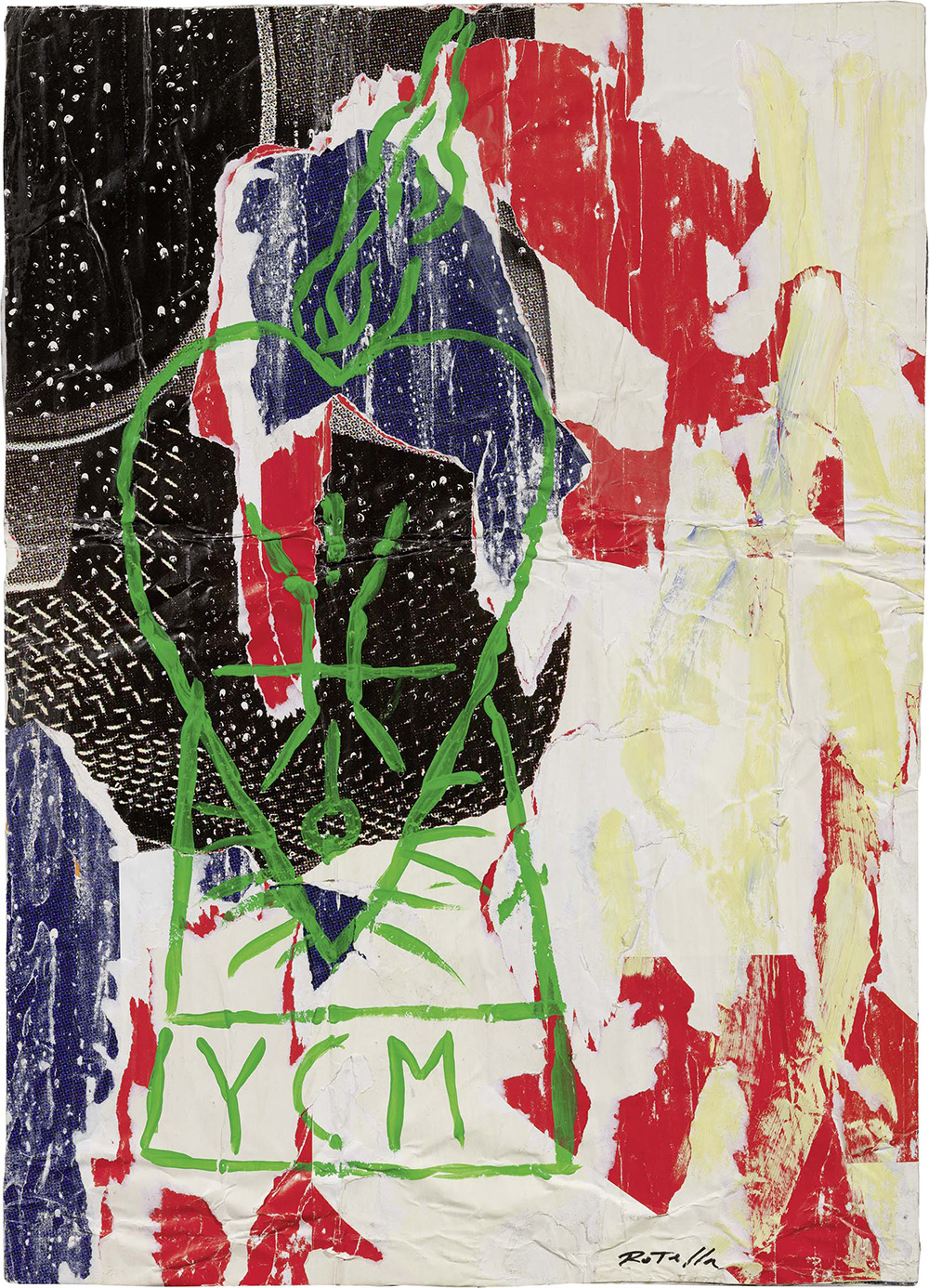 Mimmo Rotella, Catanzaro 1918 - Milano 2006, YCM, 1992, Décollage su tela, cm 70x50, Firma in basso a destra: Rotella; titolo e data al verso sulla tela: "YCM" / 92, Foto autenticata dall'artista; opera in fase di archiviazione presso l'Archivio Mimmo Rotella, Milano