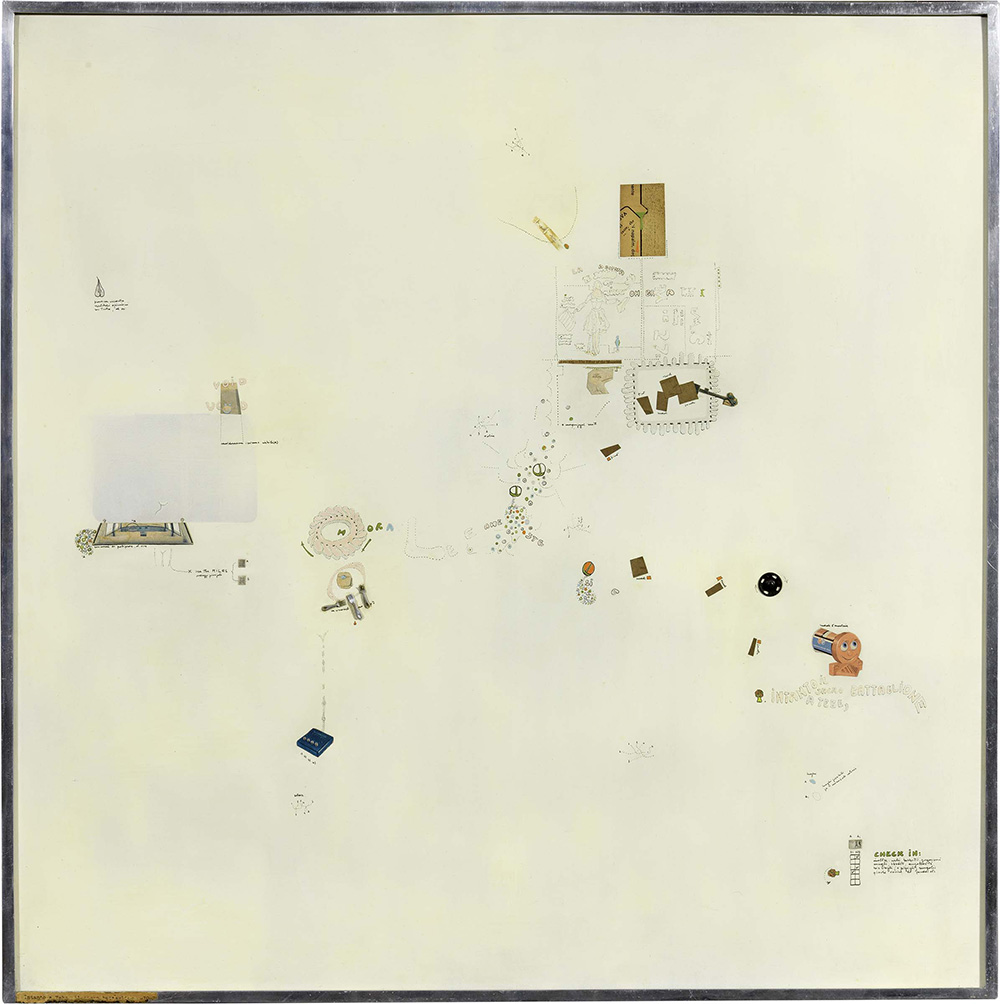 Gianfranco Baruchello, Livorno 1924, E intanto, a Tebe, il sacro battaglione, 1967, Tecnica mista su alluminio, cm 70,5x70,5, Titolo, firma e data al verso su un cartiglio, con timbro Studio d'Arte Condotti 75: Intanto, a Tebe, il / sacro battaglione / Baruchello / 1967: etichetta Collection Lambert; sul telaio: etichetta e timbro Studio d'Arte Condotti 75, Roma, con n 01229, Storia: Galleria Condotti, Roma; Collezione Lambert, Parigi; Collezione privata, Foto autenticata dall'artista in data 2007, Esposizioni: Lost in Arcadia, a cura di Andrea Bruciati, Treviso, Museo Luigi Bailo e Ca' dei Ricchi, 20 maggio - 25 giugno 2017, cat p 13, illustrata