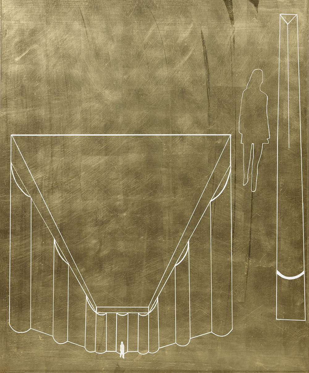 Gino De Dominicis, Ancona 1947 - Roma 1998, Prospettiva rovesciata - Appuntamento, 1987, Tecnica mista e foglia oro su tavola, cm 120x100, Firma al verso: De Dominicis, Certificato su foto di Pio Monti, Roma 9/10/2009, con n GDD/ProspettivaRovesciata/Appuntamento/TMSToro/MM/01_87; certificato su foto Fondazione Archivio Gino De Dominicis, Roma, con n GDD/ProspettivaRovesciata/Appuntamento/TMSToro/MM/01_87