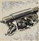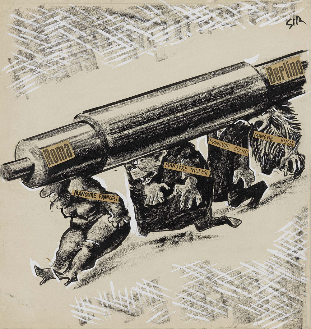 Mario Sironi, Sassari 1885 - Milano 1961, Un altro servizio alla causa della pace, 1937, Matita grassa, biacca, tempera, china e collage su carta applicata su tela, cm. 38,3x36,3, Firma in alto a destra: Sir. Al verso sul telaio cartiglio con scritta: Un altro servizio reso alla causa della pace., Opera archiviata presso l'Associazione per il Patrocinio e la Promozione della Figura e dell'Opera di Mario Sironi, Milano, al n. 184/18 RA., Illustrazione per Il Popolo d'Italia, n. 114, 25 aprile 1937, p. 1., Bibliografia, Andrea Sironi, Fabio Benzi, Sironi illustratore. Catalogo ragionato, De Luca Edizioni d'Arte, Roma, 1988, p. 121, n. 1064