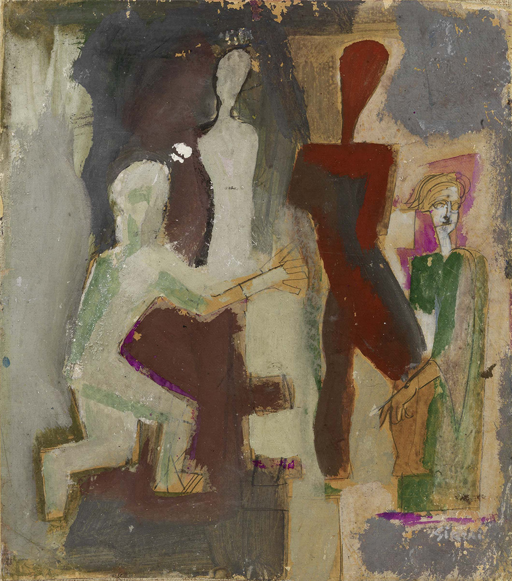 Mario Sironi, Sassari 1885 - Milano 1961, Figure, 1940 ca., Tempera, olio e matita grassa su carta applicata su tela, cm. 57,7x51,2, Reca firma in basso a destra: Sironi. Al verso sul telaio: firma Willy Macchiati., Certificato su foto di Willy Macchiati, Milano, 3 luglio '98; opera archiviata presso l'Associazione per il Patrocinio e la Promozione della Figura e dell'Opera di Mario Sironi, Milano, al n. 181/18 RA., Esposizioni, Una collezione. Opere selezionate di Maestri del '900, Teramo, Galleria Rizziero, marzo 1984, cat. p. n.n., illustrata a colori;, Mario Sironi, Roma, Galleria Russo, 26 ottobre - 23 novembre 1985, cat. n. 32, illustrata.