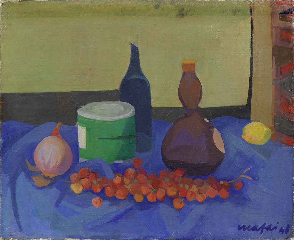 Mario Mafai, Roma 1902 - 1965, Natura morta, 1948, Olio su tela, cm. 49,5x60,5, Firma e data in basso a destra: Mafai / 48. Al verso sula tela: etichetta Galleria Gissi - Torino / Pittori Italiani Contemporanei, con n. 1249: tre timbri Galleria Gissi, Torino, di cui uno con n. 1249: timbro G. Zanini Arte Contemporanea: timbro Brera Galleria d'Arte; sul telaio: timbro G. Zanini Arte Contemporanea: timbro L'Artistica., Certificato su foto di Guido Ballo, Milano, 19 settembre 1965