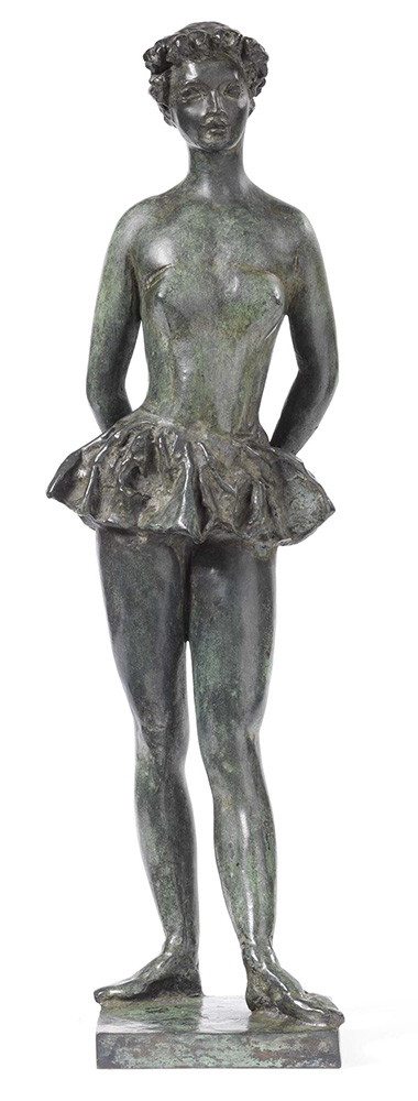 Francesco Messina, Linguaglossa (Ct) 1900 - Milano 1995, Danzatrice, 1973, Scultura in bronzo a patina verde, es. XI/XXV, cm. 50,5 h., Firma sulla base: Messina; tiratura sul retro: XI/XXV., Foto autenticata dall'artista