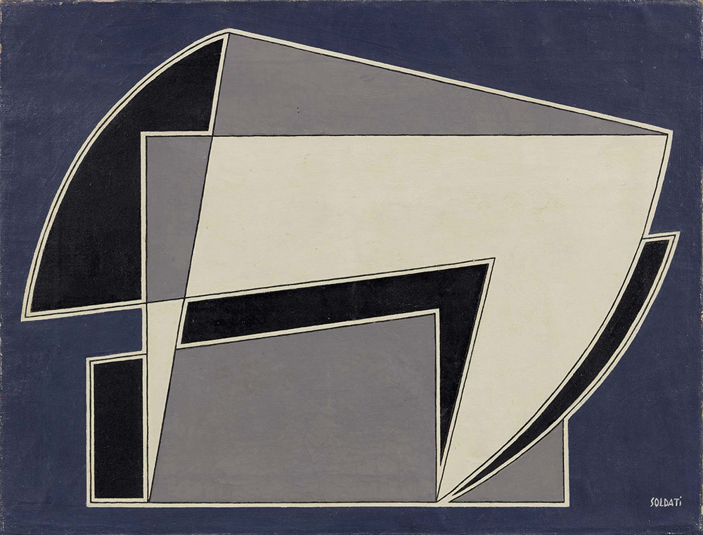 Atanasio Soldati, Parma 1896 - 1953, Composizione, 1951, Olio su tela, cm. 43,7x57,2, Firma in basso a destra: Soldati. Al verso sul telaio: etichetta Roberto Rotta Farinelli / Galleria d'Arte Moderna e Contemporanea, Genova: timbro Opere catalogate di Augusto Garau., Certificato su foto di Augusto Garau in data 26 giugno 2007, con timbro Atanasio Soldati opere autenticate e timbro Archivio Atanasio Soldati con n. 1375., Esposizioni, Reggiani e Soldati, due grandi astrattisti italiani, Cortina d'Ampezzo, Galleria Frediano Farsetti, 26 dicembre 2007 - 7 gennaio 2008, poi Milano, Farsettiarte, 16 gennaio - 13 febbraio 2008, cat. n. 20, illustrato a colori