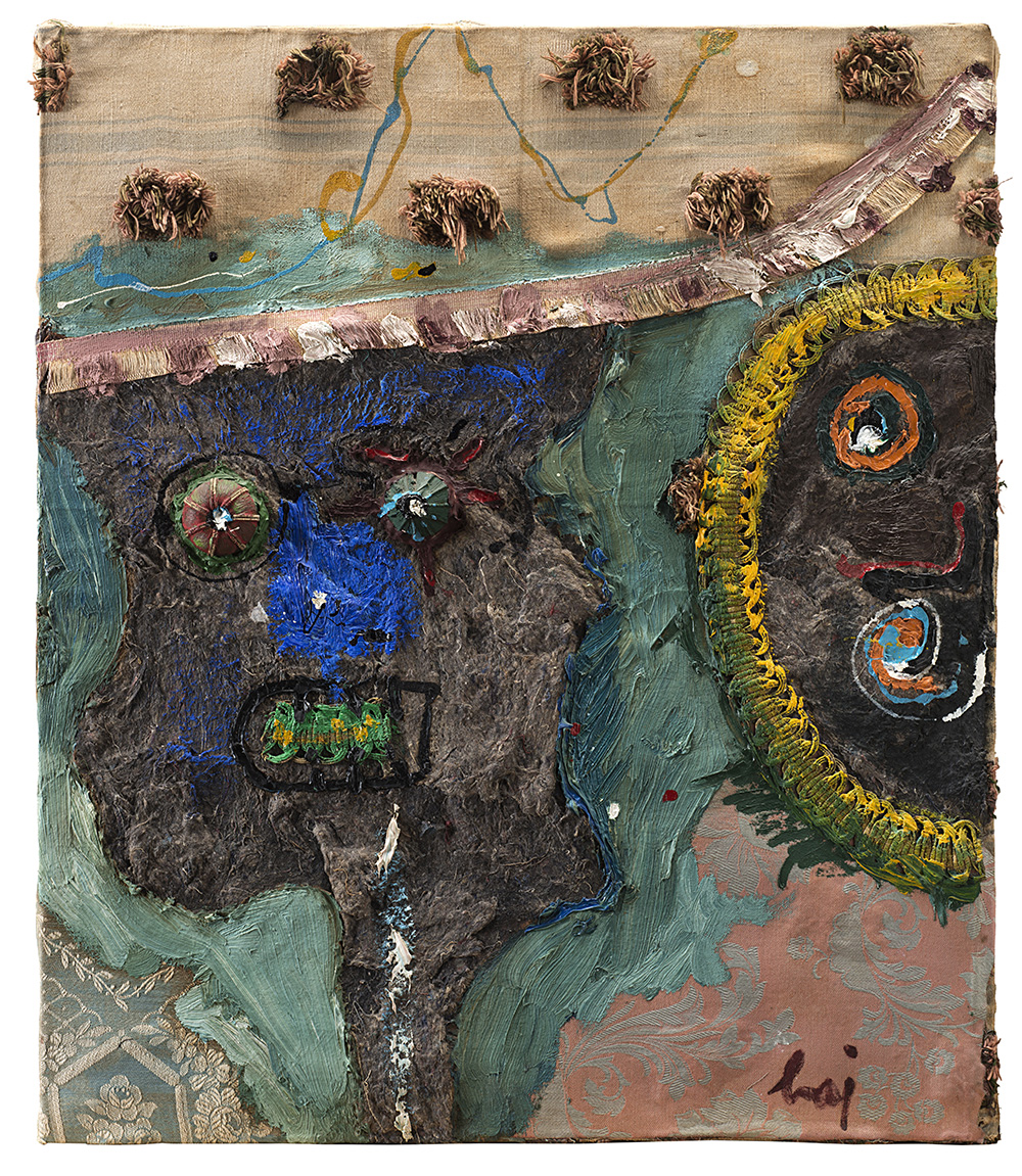 collage, passamaneria, ovatta, stoffa e olio su tela
