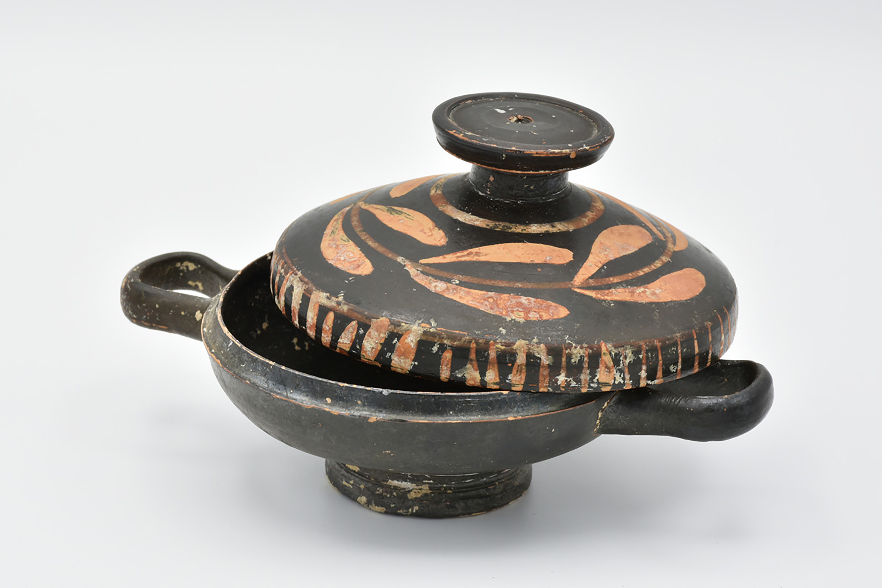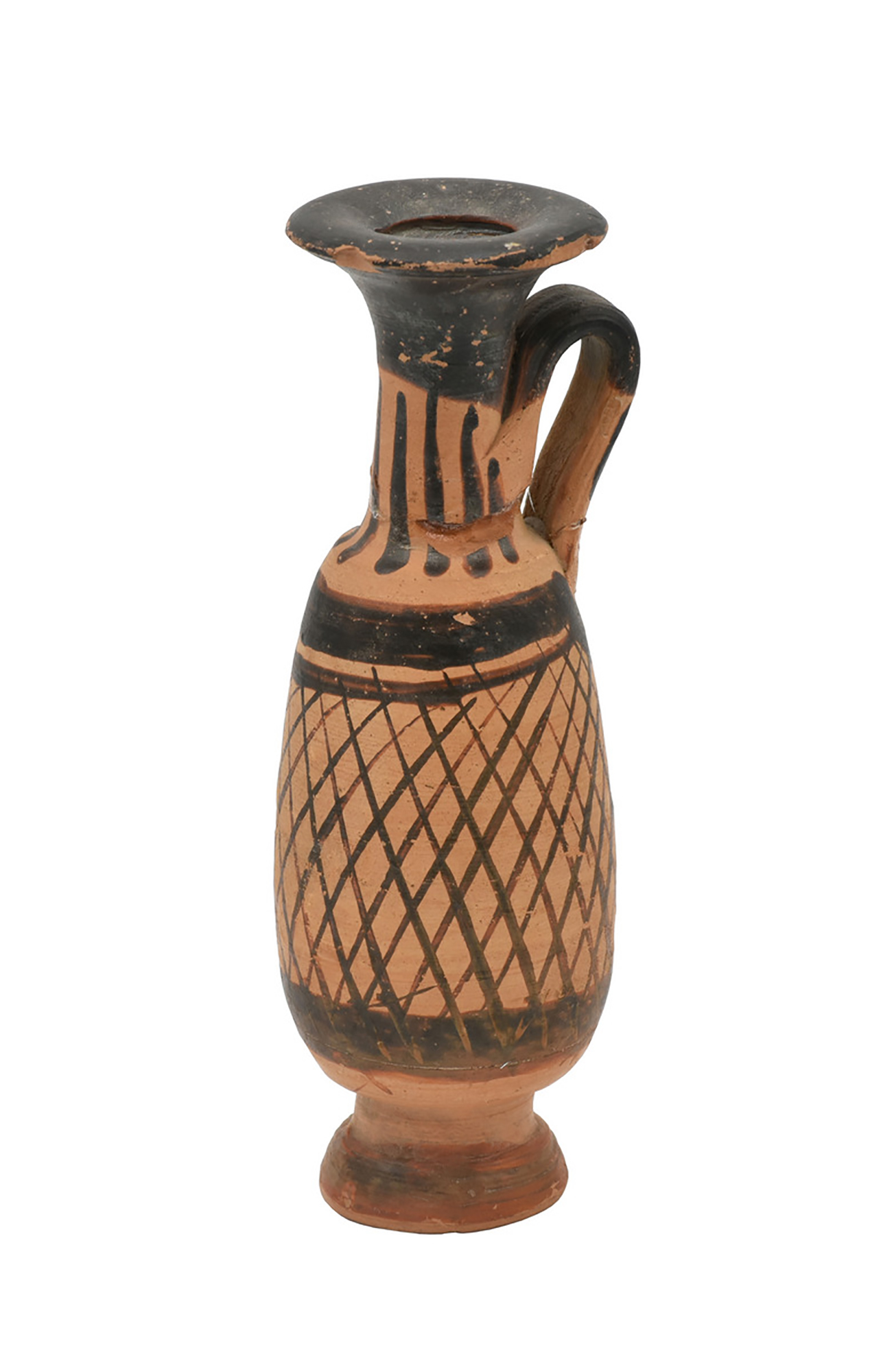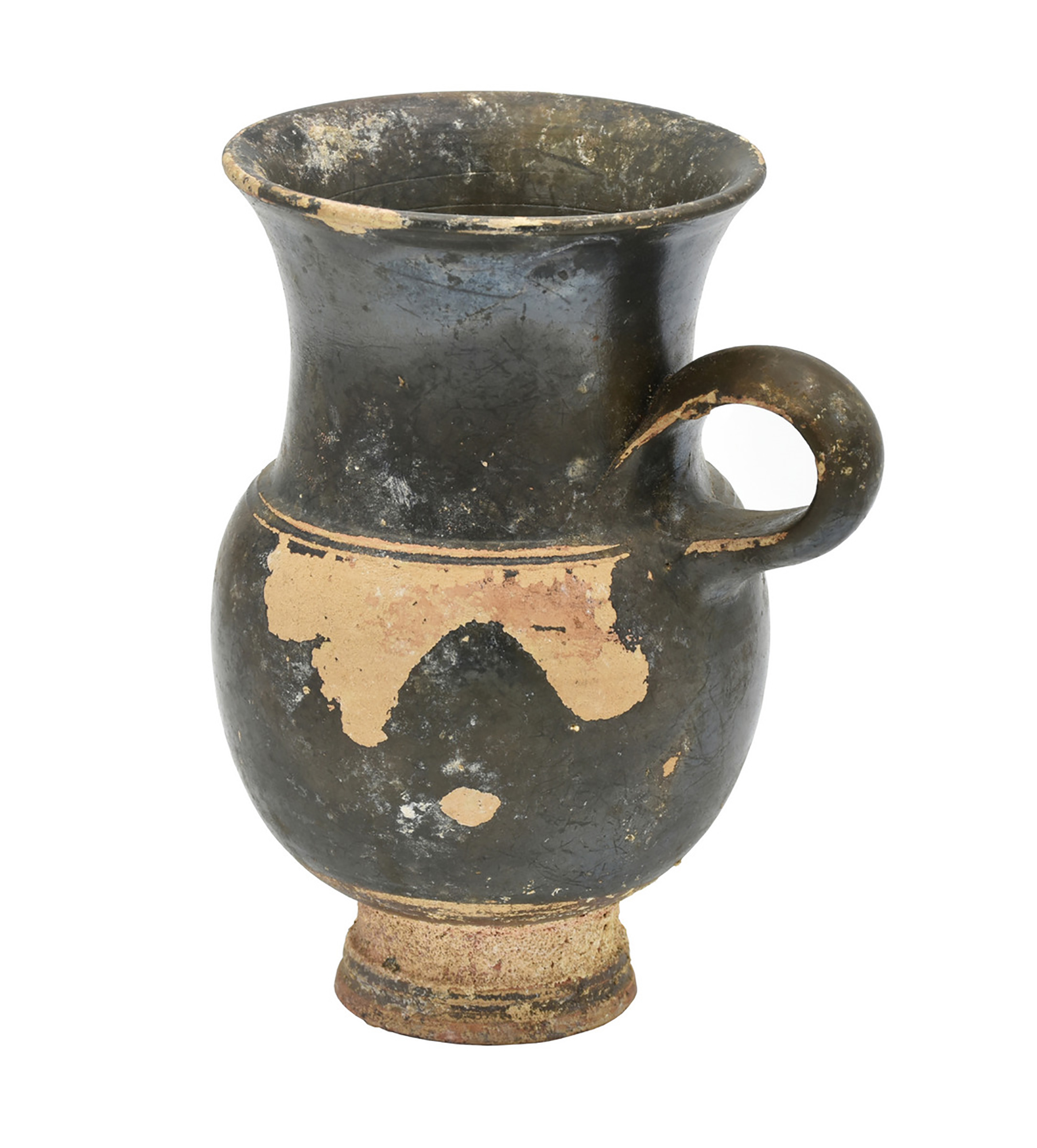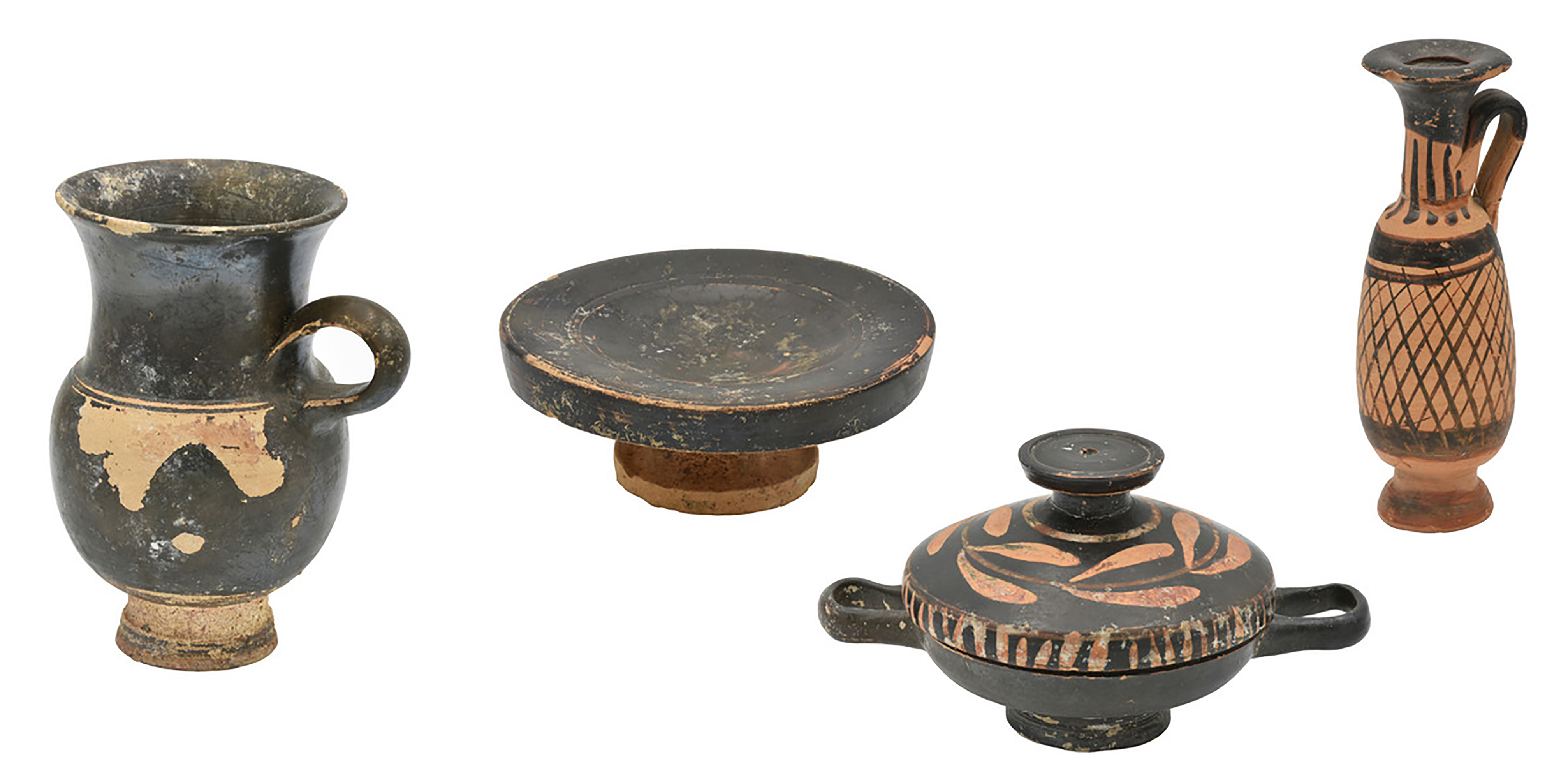 QUATTRO VASI A VERNICE NERA DATAZIONE: IV sec. a.C. MATERIA E TECNICA: argilla figulina rosata, vernice nera lucente e rosso opaca, modellati a tornio veloce Piattello a vernice nera su piede a tromba, con labbro pendulo e vasca poco profonda; piccola lekanis decorata in rosso con tralcio di olivo sul coperchio e falsa baccellatura sul bordo; lekythos a reticolo, con bocchello campanulato, collo cilindrico allungato, ansa a bastoncello impostata dalla spalla alla base del collo; brevissima spalla e corpo ovoide, piede troncoconico sagomato, decorata con reticolo in nero sul corpo; una piccola olpe a vernice nera con orlo svasato, collo cilindrico a profilo concavo, corpo globulare, piede campanulato (4) PRODUZIONE: ceramica apula a vernice nera STATO DI CONSERVAZIONE: integri DIMENSIONI: alt. da cm 13 a cm 5,5 PROVENIENZA: Gorny & Mosch, Monaco; Bertolami Fine Arts, Roma