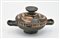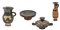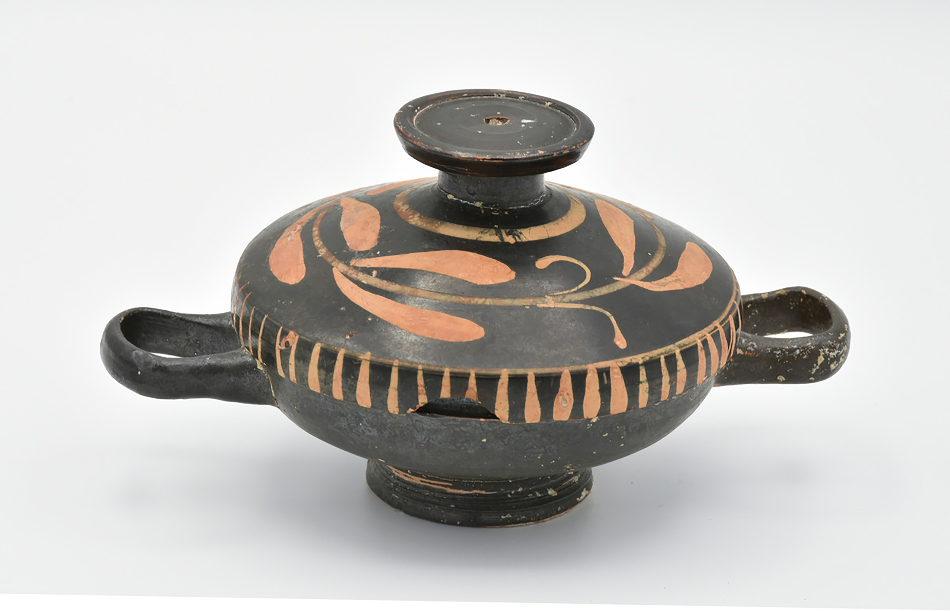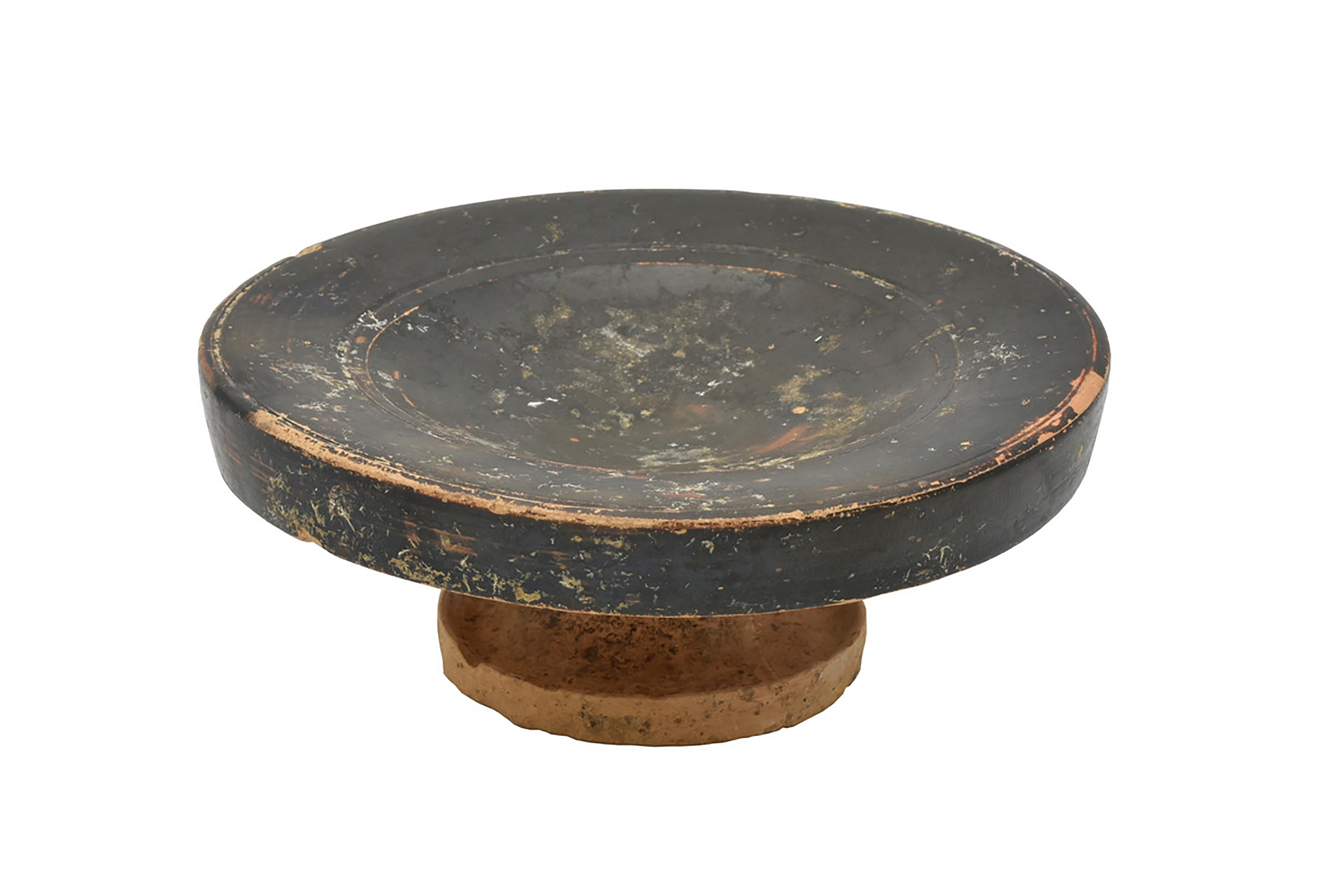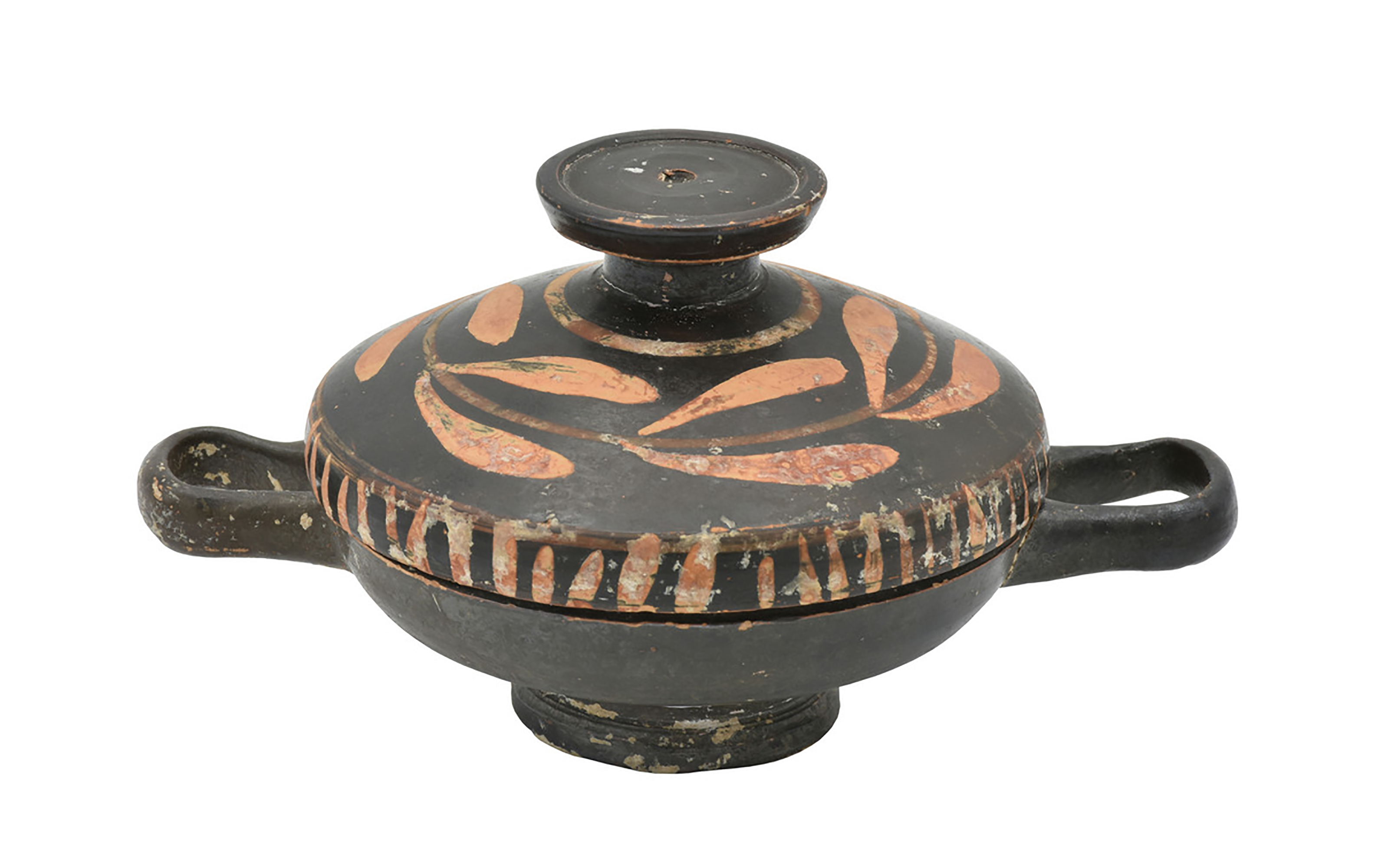 QUATTRO VASI A VERNICE NERA DATAZIONE: IV sec. a.C. MATERIA E TECNICA: argilla figulina rosata, vernice nera lucente e rosso opaca, modellati a tornio veloce Piattello a vernice nera su piede a tromba, con labbro pendulo e vasca poco profonda; piccola lekanis decorata in rosso con tralcio di olivo sul coperchio e falsa baccellatura sul bordo; lekythos a reticolo, con bocchello campanulato, collo cilindrico allungato, ansa a bastoncello impostata dalla spalla alla base del collo; brevissima spalla e corpo ovoide, piede troncoconico sagomato, decorata con reticolo in nero sul corpo; una piccola olpe a vernice nera con orlo svasato, collo cilindrico a profilo concavo, corpo globulare, piede campanulato (4) PRODUZIONE: ceramica apula a vernice nera STATO DI CONSERVAZIONE: integri DIMENSIONI: alt. da cm 13 a cm 5,5 PROVENIENZA: Gorny & Mosch, Monaco; Bertolami Fine Arts, Roma