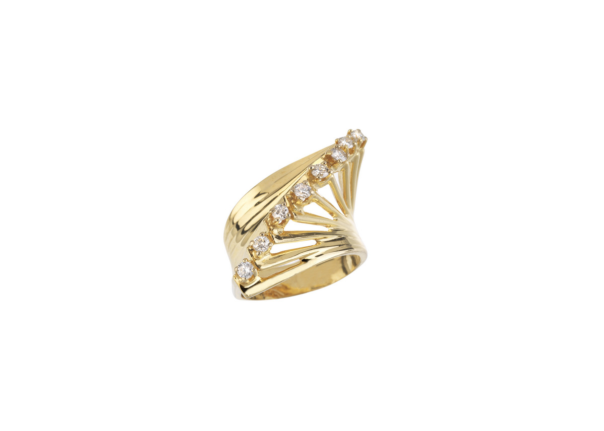 ANELLO IN ORO 14 K E DIAMANTI disegnato come un’alta fascia in oro giallo traforato a formare una linea di castoni a raggera decorati in diamanti, punzone 14K, mis. 17 DIAMOND AND 14 K YELLOW GOLD RING
