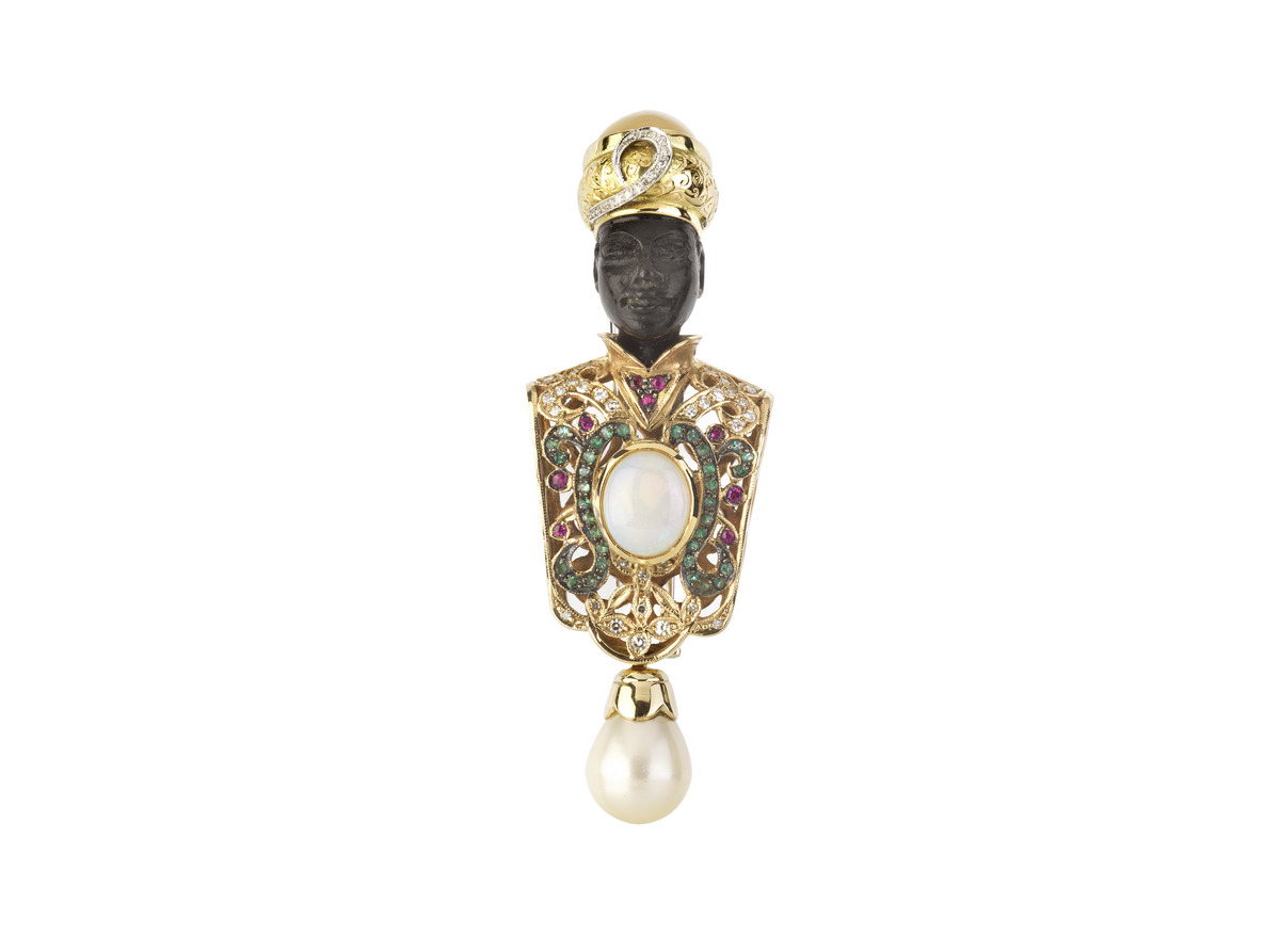 SPILLA MORETTO IN ORO A BASSO TITOLO, EBANO, DIAMANTI, RUBINI, SMERALDI, OPALE, PIETRA DI LUNA E PERLA disegnata come un busto in oro 10k sagomato e traforato a volute decorate in diamanti, rubini sintetici e smeraldi al quale è sospesa una perla a goccia, la testa in ebano intagliato, il turbante impreziosito da una pietra di luna color caramello, dim. cm 7,5x2,5 A 10 K YELLOW GOLD, EBONY, DIAMOND, RUBY, EMERALD, OPAL, MOONSTONE AND PEARL BLACKAMOOR BROOCH