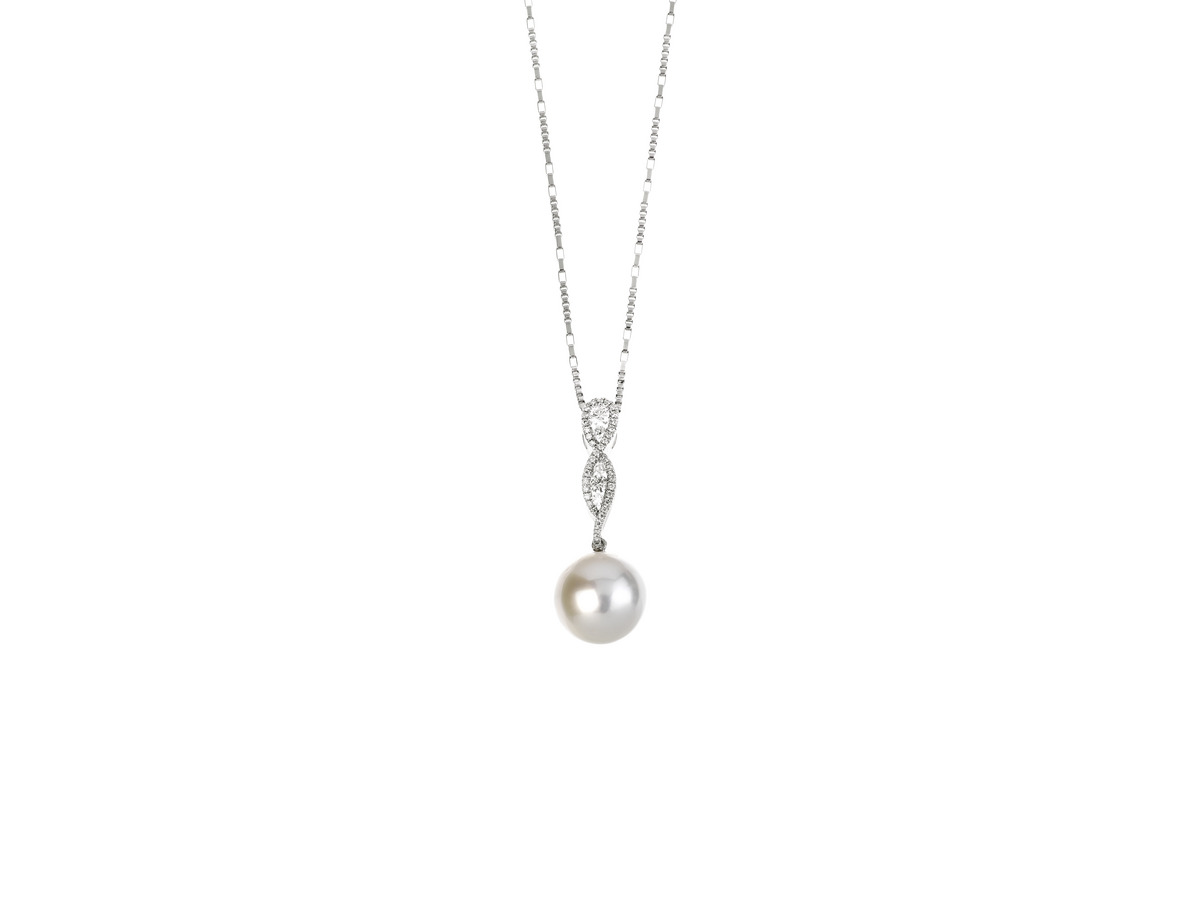 in oro sagomato e traforato a corolle in pavé centrate da diamanti alla quale è sospesa una perla di mm 10,9-11,05 corredato di catena a sezione quadrata, punzone 750, lugh. cm 45,5