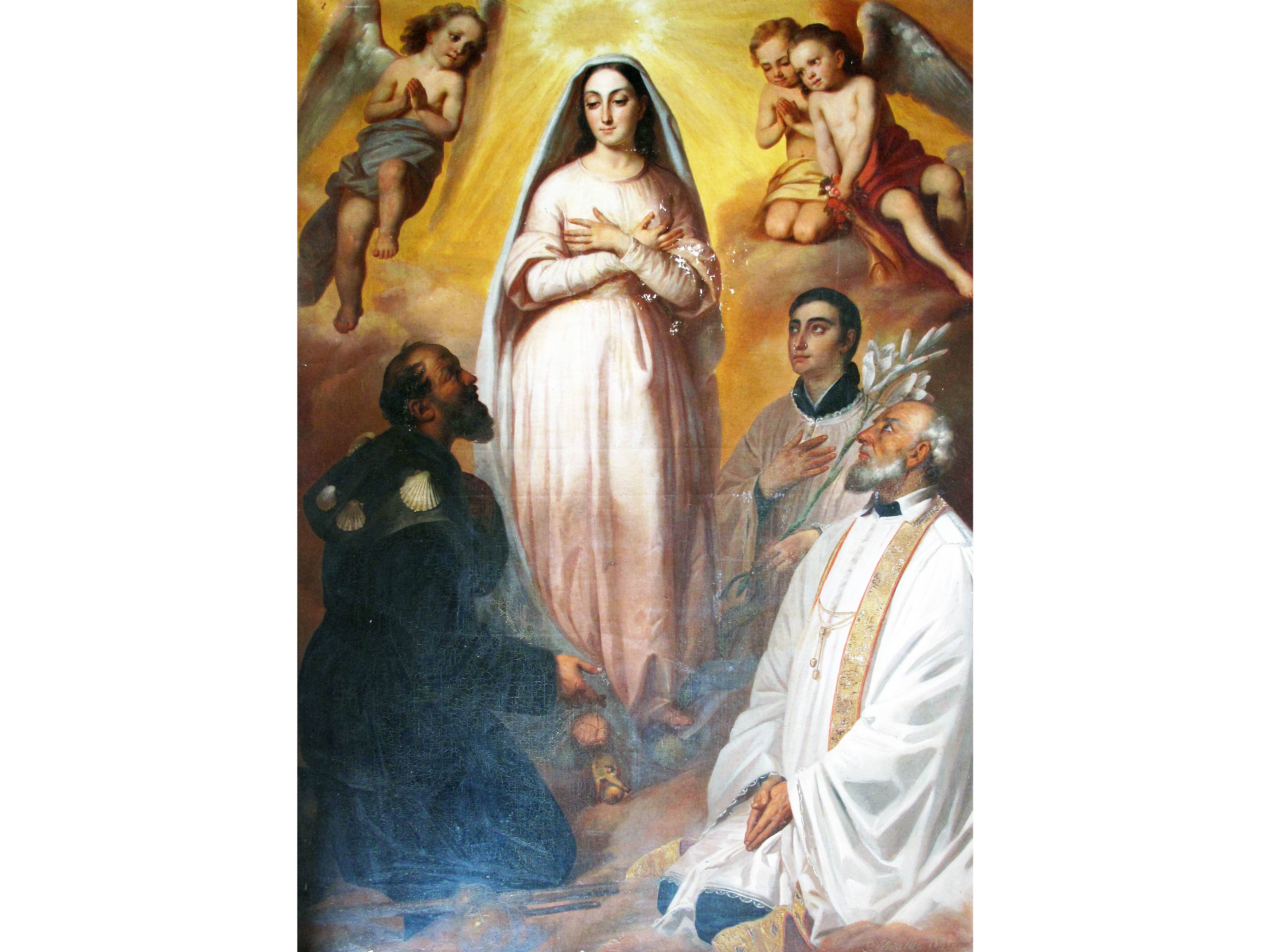 P. Vivaldi (XIX) Madonna con Angeli San Giacomo e San Luigi Gonzaga Olio su tela Firmato e datato 1841 Misure 122.5x54 cm
