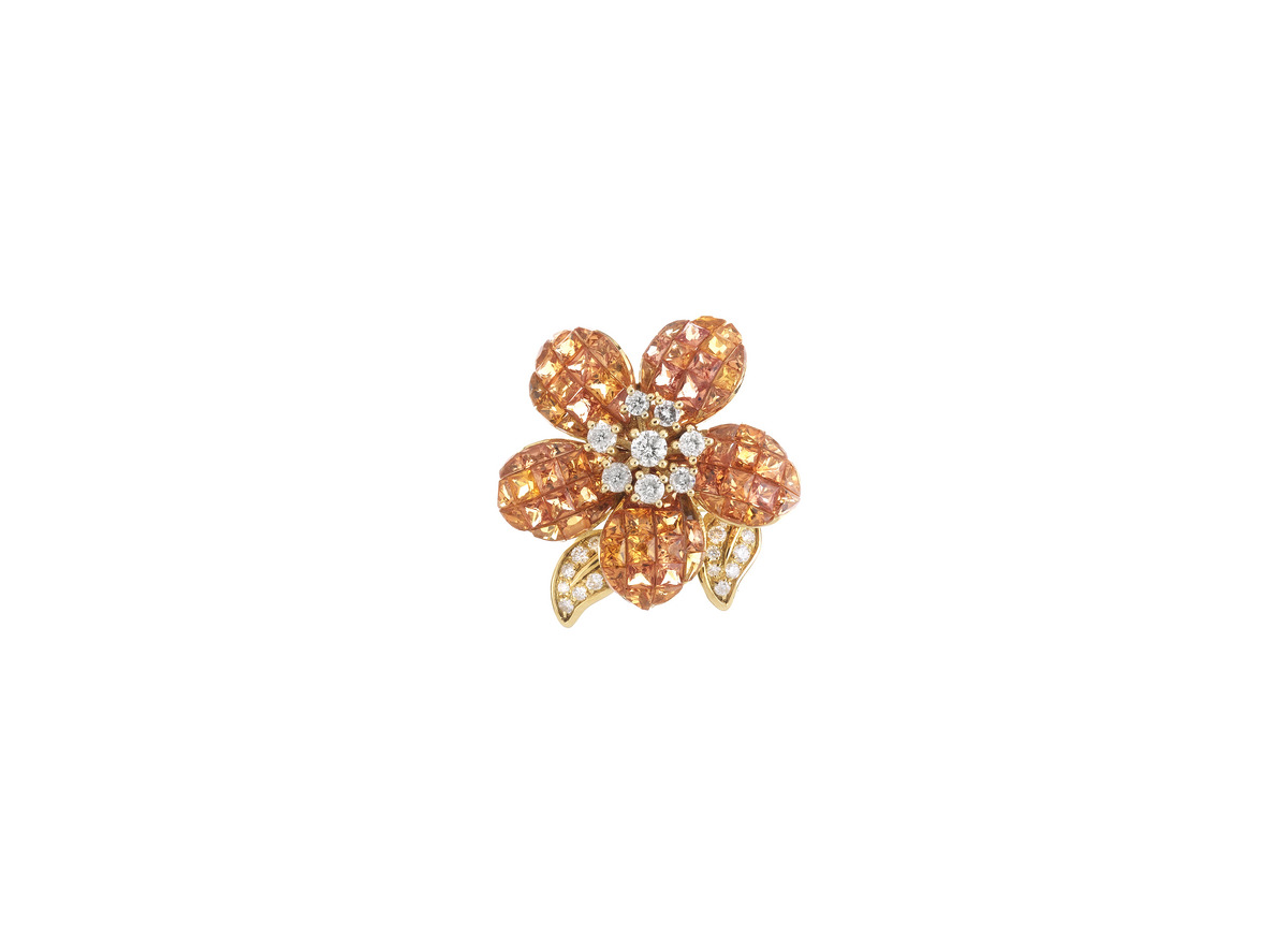 ANELLO IN ORO GIALLO, ZAFFIRI GIALLI E DIAMANTI al centro una corolla in zaffiri giallo-arancio taglio quadrato, il pistillo in diamanti, le foglie in pavé di brillanti, punzone 750, mis. 14 YELLOW SAPPHIRE, DIAMOND AND YELLOW GOLD FLOWER RING