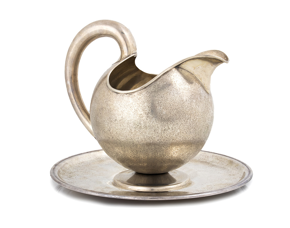 LUIGI GENAZZI Brocca con piattino Argento, brocca h. 20 cm; piatto d. 25, 6 cm Marchio inciso sotto la base: Genazzi Milano