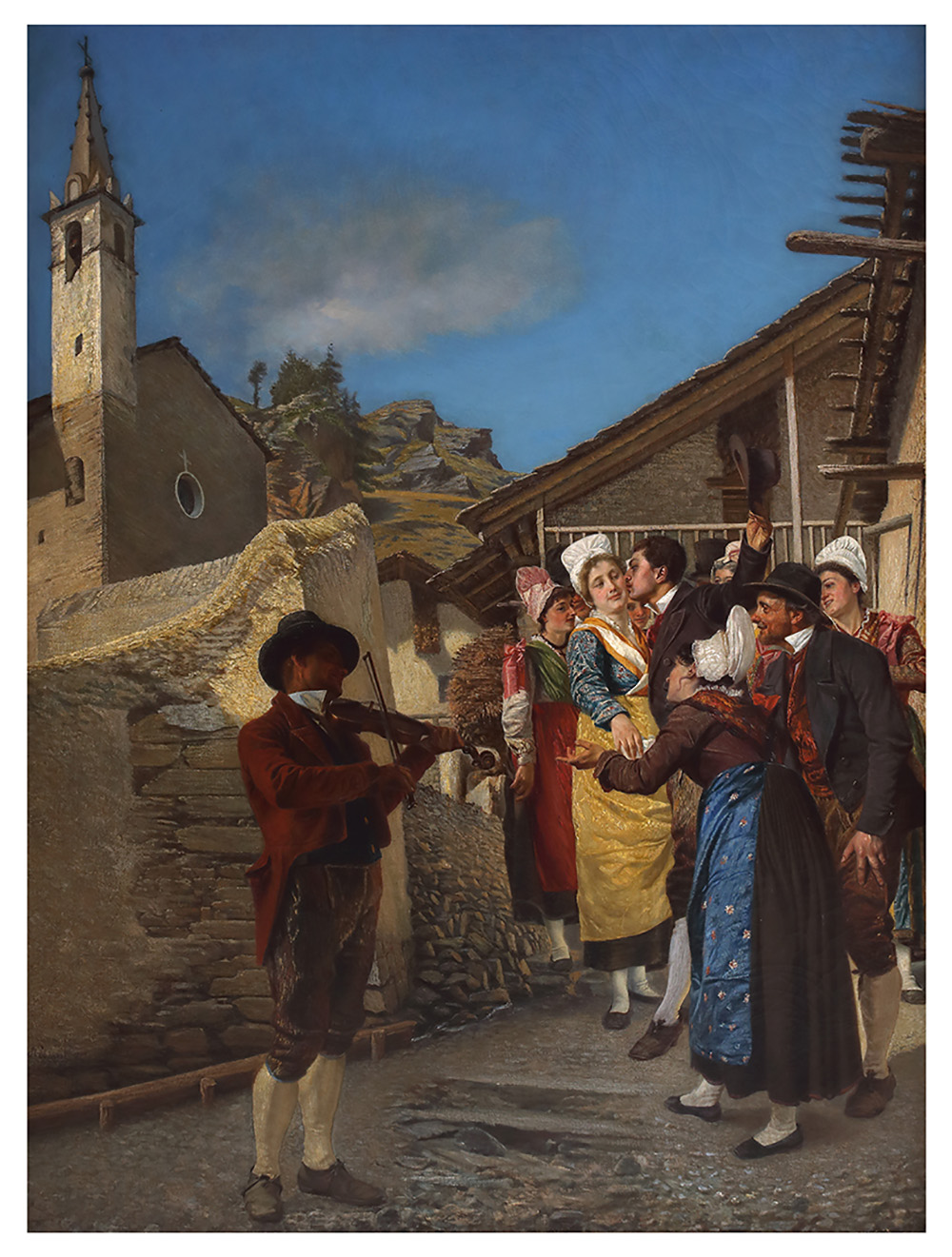 LUIGI NOVARESE Nozze nella valle di Pragelato (Alpi Cozie), Metà ‘800 Olio su tela, 130 x 96 cm Cornice coeva. PUBBLICAZIONI Catalogo della mostra “IV Esposizione Nazionale di Belle Arti”, Ed. V. Bona, Torino, 1880, n. 594 ESPOSIZIONI IV Esposizione Nazionale di Bell Arti, Torino, 1880