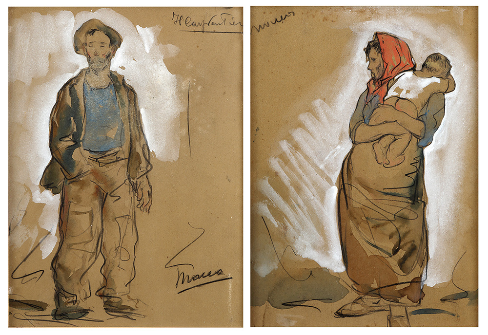 MACEO CASADEI Il Carpentiere e la Contadina col bambino Tecnica mista su carta, 30 x 22 cm circa; 24 x 17,5 cm Firma in basso a destra del Carpentiere: Maceo Firma in alto a sinistra della Contadina: Maceo
