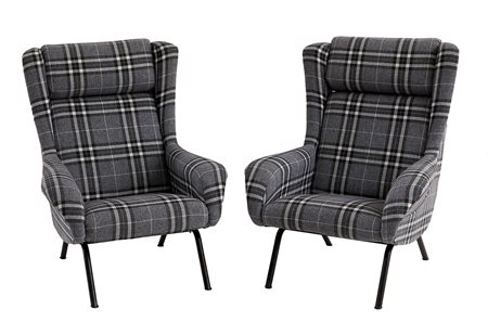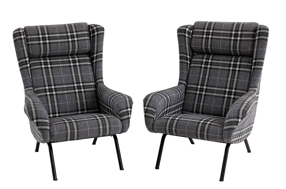 CASSINA - ITALIA Coppia di poltrone rivestite con stoffa a decoro scozzese, Anni '60 Stoffa e legno, 102 x 76 cm Nuovo rivestimento
