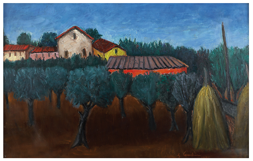 GISBERTO CERACCHINI Paesaggio con covoni e ulivi, 1970 Olio su tavola, 51 x...