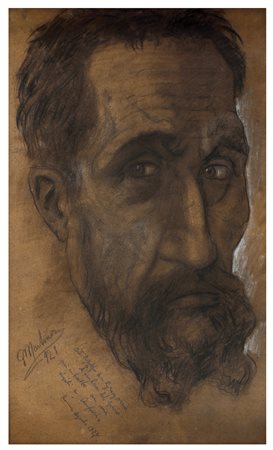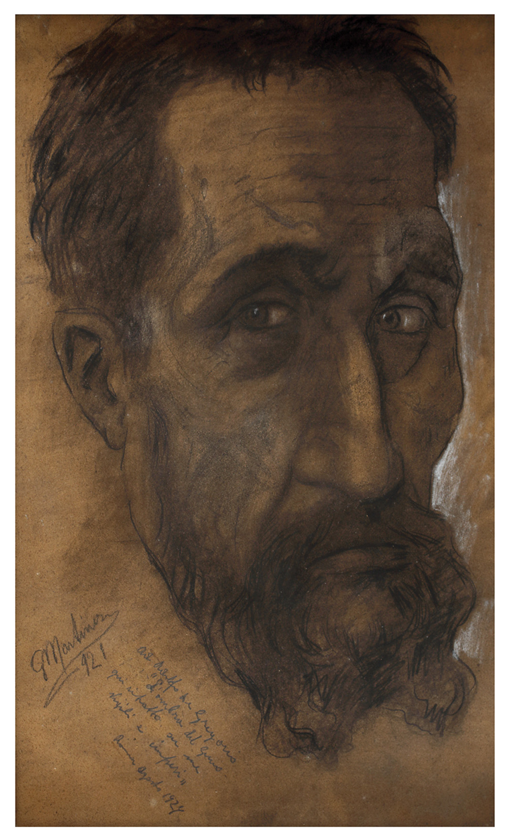 GAETANO MARTINEZ Michelangelo Buonarroti, 1921 Tecnica mista su carta, 50,5 x 32,5 cm Firma, data e dedica in basso a sinistra: G. Martinez 921, “Ad Adolfo, L’ombra del genio qui ritratto su me vigilli e imperi, Roma, agosto 1927”