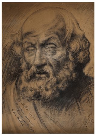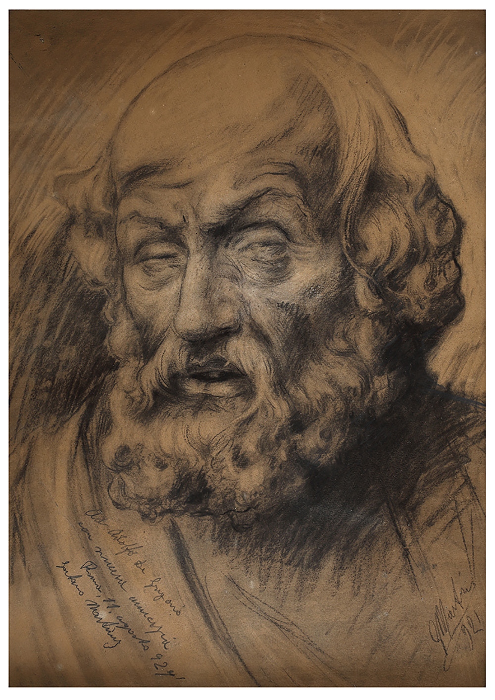 GAETANO MARTINEZ Socrate, 1921 Tecnica mista su carta, 45 x 31,5 cm Firma e data in basso a destra: G. Martinez 921 Dedica, data e firma in basso a sinistra: “Ad Astolfo de Gregorio, con sincera amicizia, Roma, 11 agosto 927, Gaetano Martinez”