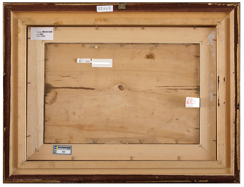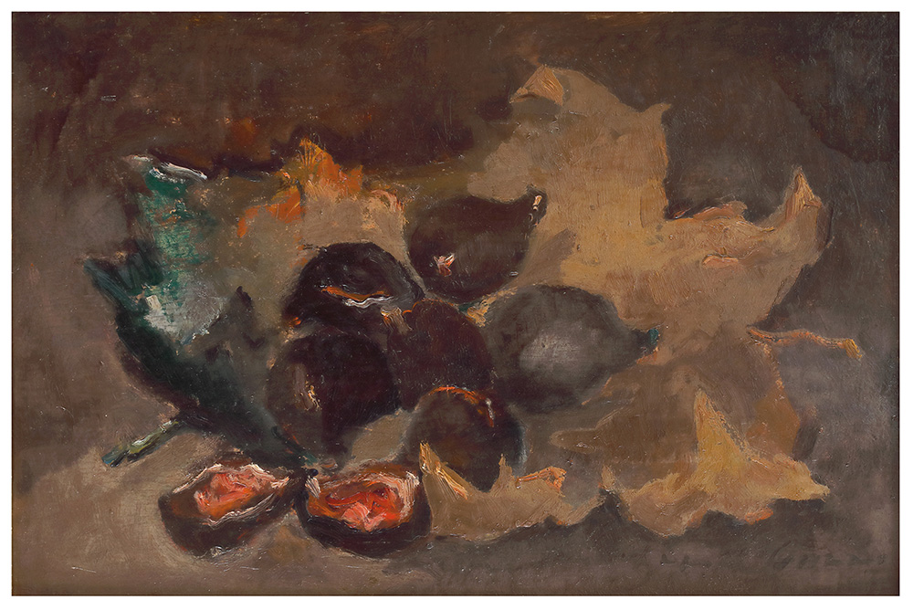 BEPPE GUZZI Natura morta con fichi, 1945 Olio su compensato, 23,5 x 35,5 cm Firma in basso a destra: Guzzi