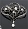 SPILLA Spilla in oro e argento, anni '20, con tre diamanti taglio brillante rotondo per complessivi ct 0,60 ca, diamanti (uno mancante) e due perline di cui una pendente Peso gr. 12,8