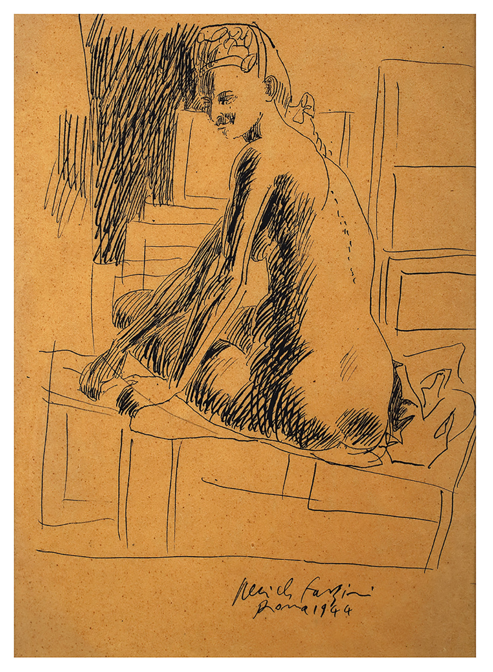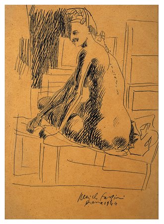 PERICLE FAZZINI Nudo di donna di spalle, 1944 China su carta marrone, 35,5 x 25,5 cm circa Firma, luogo e data in basso a destra: Pericle Fazzini Roma 1944