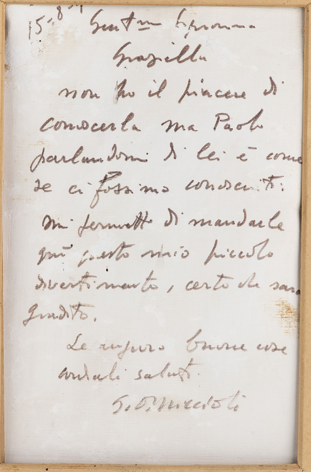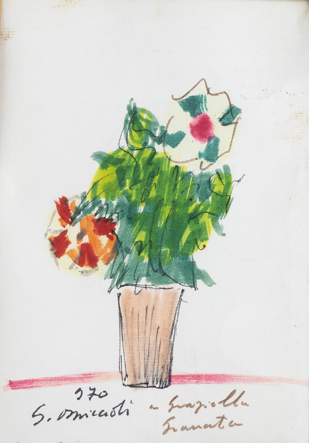 GIOVANNI OMICCIOLI Vasetto di fiori, 1970 Tecnica mista su carta, 16 x 11 cm circa Firma, data e dedica in basso al centro: G. Omiccioli, 970, “A Graziella Granata” Dedica e firma al retro il 15 agosto 1970