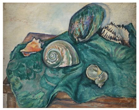 LUIGI SCARPA CROCE Natura morta marina, 1930 Olio su tavola, 29,5 x 37,5 cm Firma e data in basso a destra: Scarpa Croce 1930 Firma e data al retro: Scarpa Croce 1930 Timbro al retro della Bottega d’Arte di Livorno