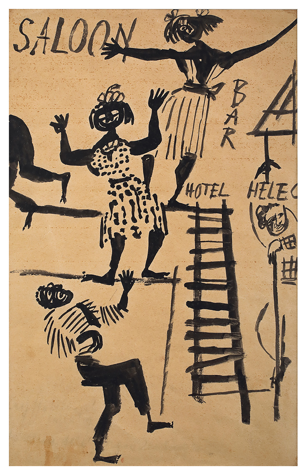 EMANUELE LUZZATI Saloon Tecnica mista su carta marrone, 30,5 x 19,5 cm circa Titolo in alto a sinistra: Saloon