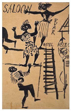EMANUELE LUZZATI Saloon Tecnica mista su carta marrone, 30,5 x 19,5 cm circa...