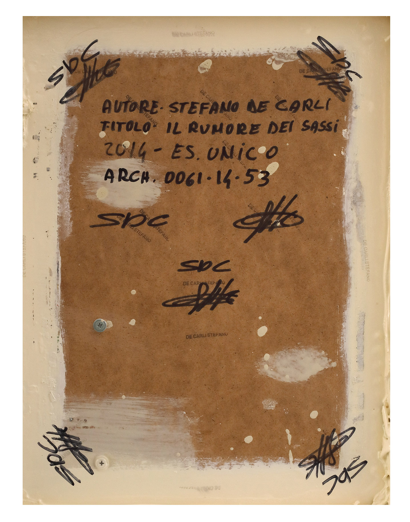 STEFANO DE CARLI Il rumore dei sassi, 2014 Tecnica mista su tela, 50 x 60 cm circa Firma, timbro, autentica dell’Artista e n° d’archivio al retro