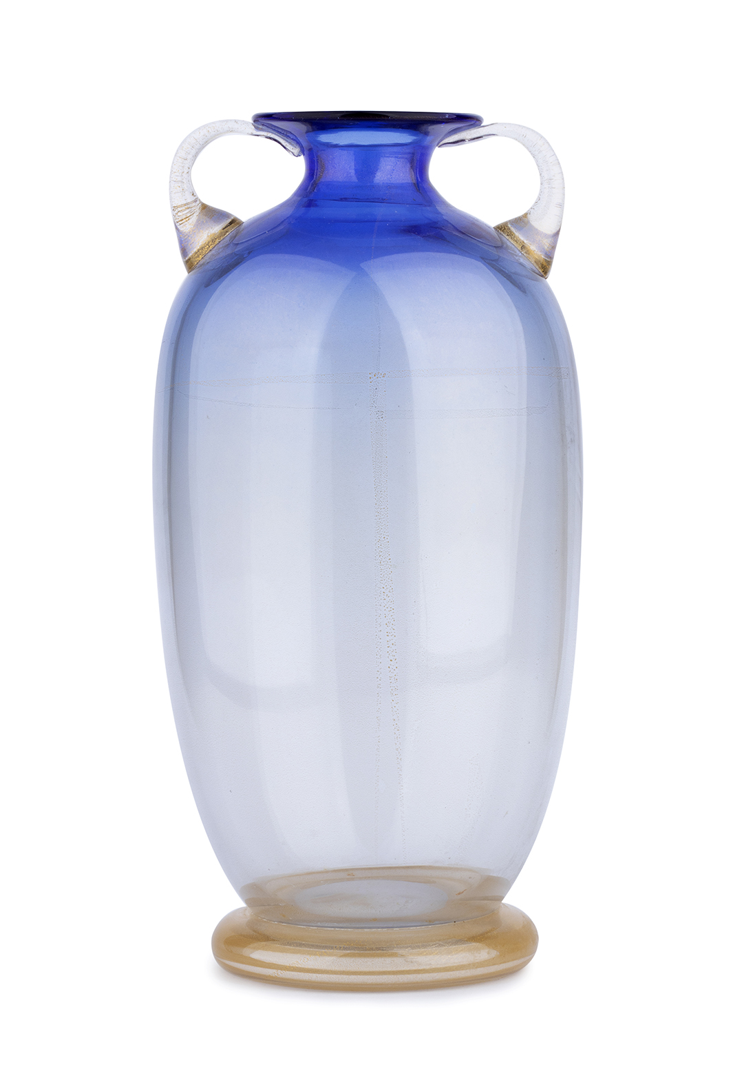 FRATELLI TOSO - MURANO Vaso in vetro trasparente blu decorato a motivi vegetali e foglia oro, 1940 Vetro, h. 36 cm Firma sotto la base: Toso Murano