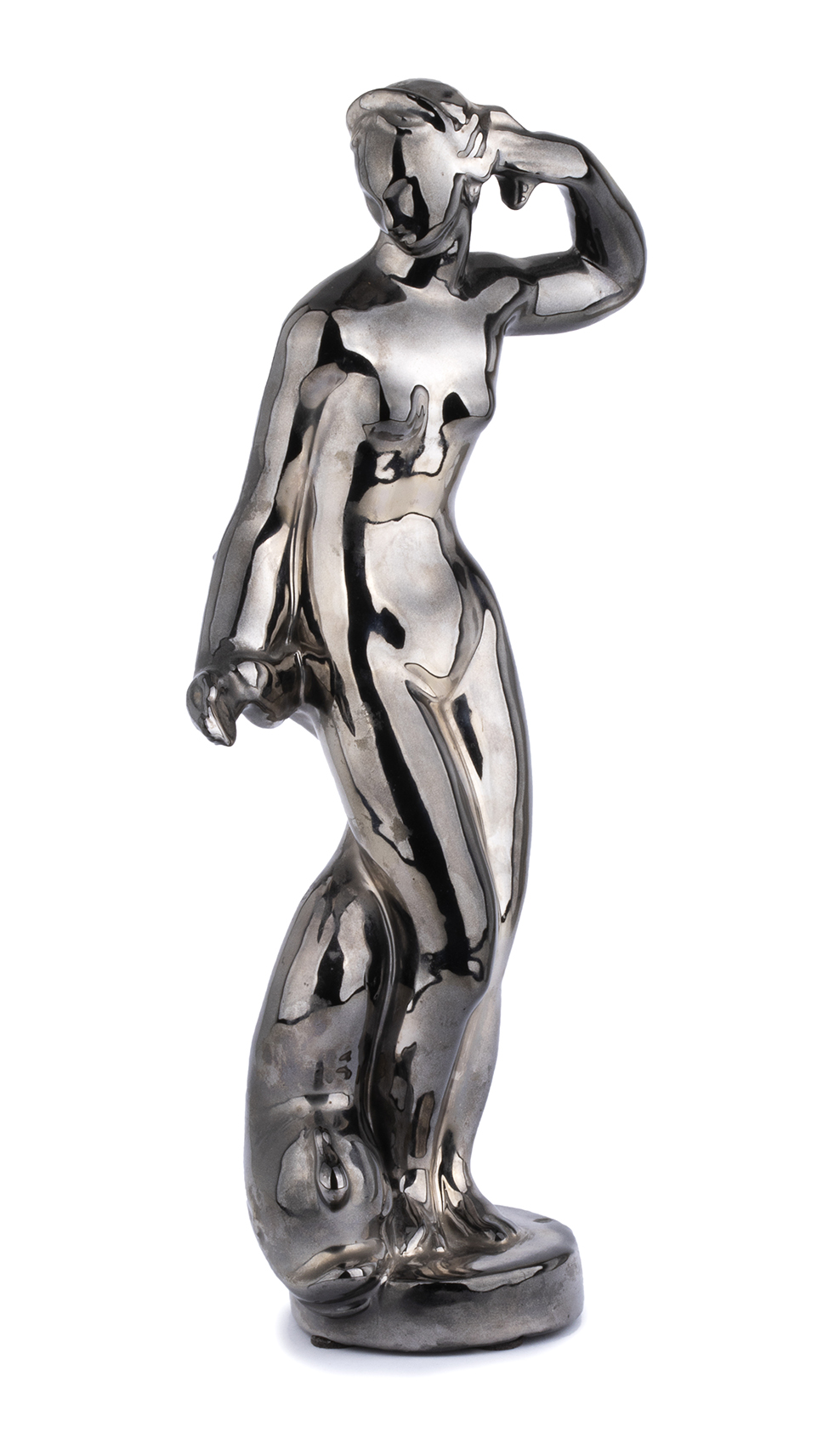 ROMETTI - UMBERTIDE, ITALIA Statuetta di figura femminile con delfino, 1933-34 Ceramica con spruzzatura al platino, h. 48 cm PUBBLICAZIONI E. Mascelloni, M. Caputo, “Le ceramiche Rometti”, Skira, Milano, p. 69, n° 57 E. Mascelloni, “Amabili presenze. Le ceramiche Rometti. Dall'Art Déco al design 1927-2012”,Palombi Editori, 2012