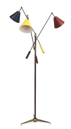 ANGELO LELLI - ARREDOLUCE, ITALIA Lampada da terra modello 12128 detto “Triennale”, 1951 Tre punti luce orientabili con diffusori verniciati nei tre colori primari, struttura in ottone e metallo laccato nero, base in fusione di ghisa, h. 170 cm Inciso sotto la base: Arredoluce, Monza La Lampada è stata presentata alla IX Triennale di Milano nel 1951 PUBBLICAZIONI C. e P. Fiell, “1000 lights”, Taschen, 2005, pp. 298, 299; A. De Cristofaro, “Antiquariato del '900. Lampade anni '50”, Il Sole 24 Ore, Cultura, 2013, p. 39