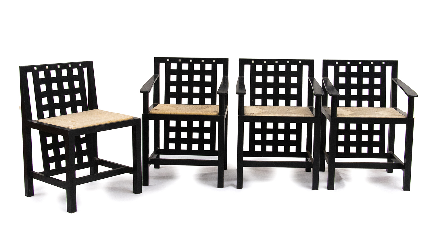 CASSINA - ITALIA Quattro sedie modello “Mackintosh” in legno laccato nero Legno di frassino e paglia, 75 x 49 x 39 cm