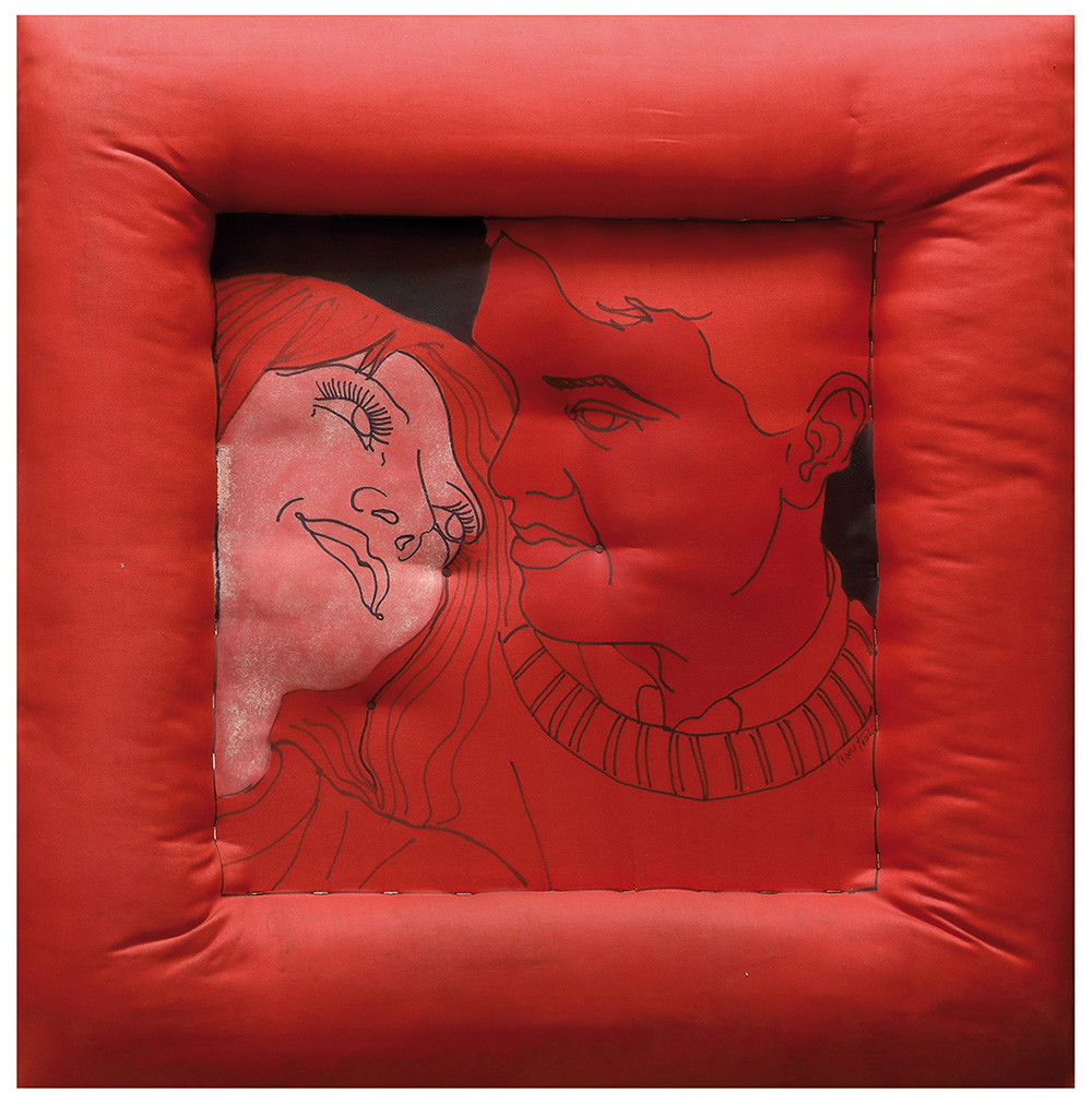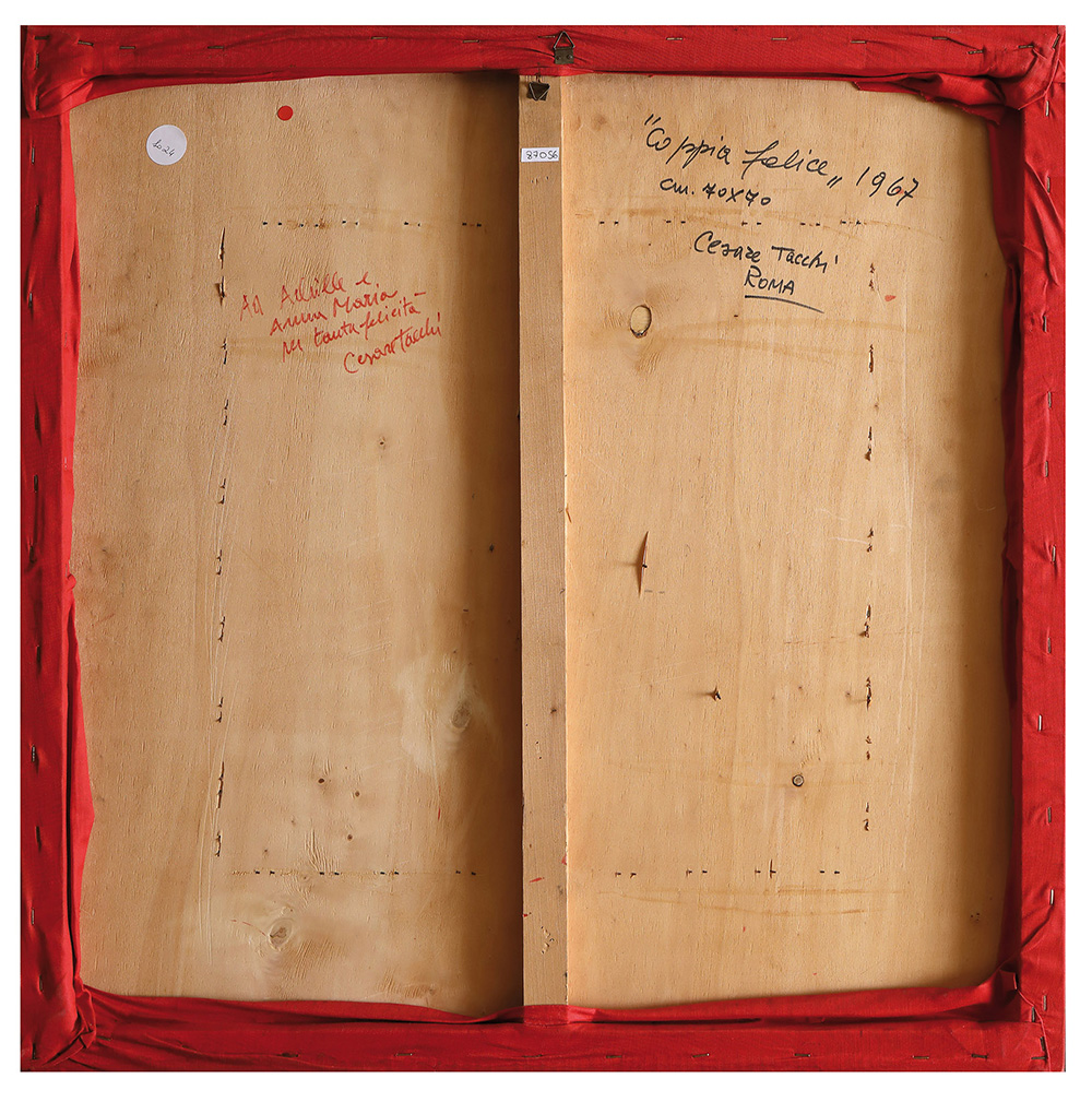 CESARE TACCHI Coppia felice, 1967 Tecnica mista e inchiostro su tessuto rosso imbottito applicato su tavola, 70 x 70 x 7 cm Titolo, data, firma, luogo e dedica al retro: Coppia felice, 1967, Cesare Tacchi, Roma, “Ad Achille e Anna Maria per tanta felicità” Autentica su foto dell’Archivio Cesare Tacchi, Roma, 2017 ESPOSIZIONI “Tano Festa e gli Amici di Piazza del Popolo”, Azimut Capital Management, Maggio - Giugno 2017, Roma