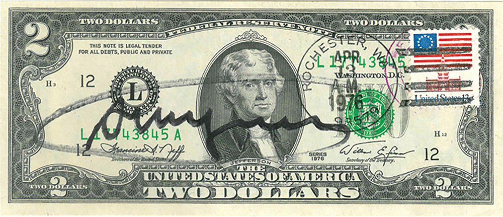 Alcuni esemplari sono pubblicati sul catalogo “Andy Warhol Vetrine” a cura di Achille Bonito Oliva, Silvana Editoriale, 2014. Un esemplare è pubblicato sul catalogo per l’esposizione “Pop Icons”, 20 gennaio - 6 febbraio 2015, Galleria Restelliartco, Roma, autorizzata da ‘The Andy Warhol Foundation for the Visual Arts,Inc’ by SIAE 2015, Editore Factory Additions (New York). I due dollari di Jefferson sono molto rari, reintrodotti nel 1976 e gradualmente usciti fuori circolazione. Andy Warhol li timbra 13 Aprile 1976, come 13 centesimi è il valore del francobollo, quanti erano gli Stati d’America al momento della liberazione. Il retro dei due dollari raffigura un quadro di Trumbull del 1816 sulla Dichiarazione d’Indipendenza Americana.