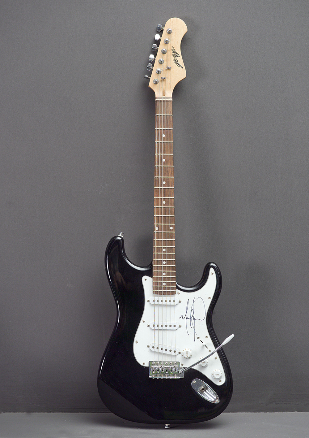 MICHAEL JACKSON Chitarra elettrica Fender Stratocaster, Signature edition, Legni pregiati, 98 x 34 cm Chitarra elettrica con corpo nero e battipenna bianco, firmata a mano da Michael Jackson, davanti all'hotel Lanesborough, Londra, Regno Unito, marzo 2009.