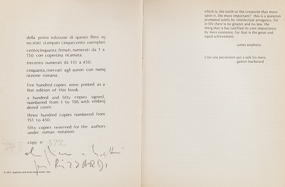 Jean-Christophe Ammann "Alighiero Boetti. Catalogo generale. Tomo secondo. Opere 1972-1979" Milan, Electa, 2012, p. 270 n. 909, ill. a colori (another version)This work is accompanied by a photo-certificate issued by the Archivio Alighiero Boetti, Rome, with n. 5986