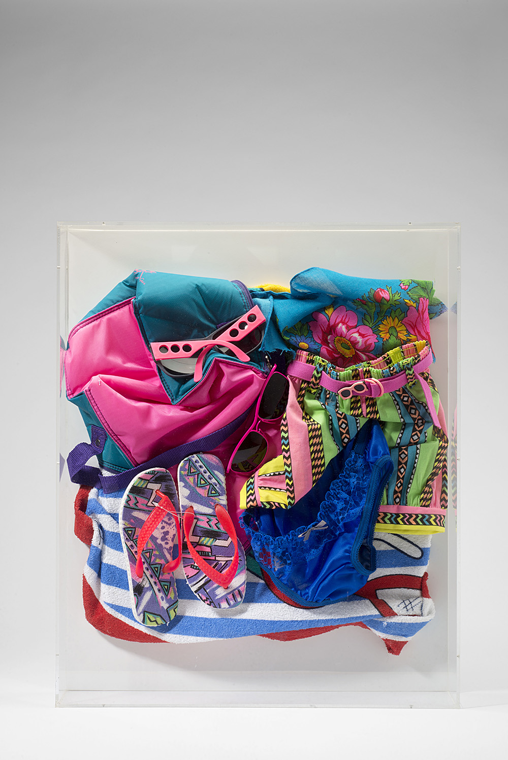 accumulazione di vestiti e oggetti in teca in plexiglass