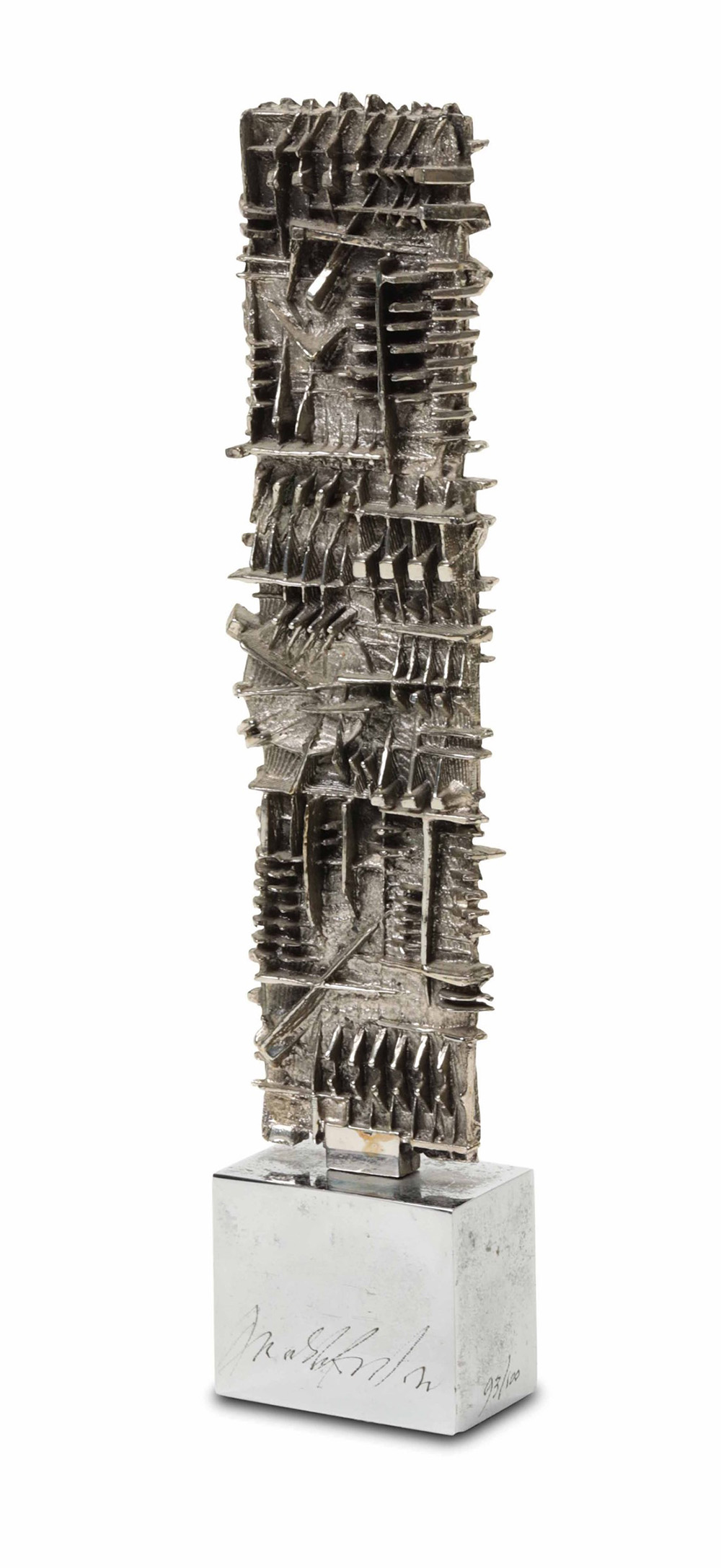 Arnaldo Pomodoro (1926), Scultura a stele, 1986 bronzo argentato, cm 18x5; compresa la base cm 22,5x5x3 ca firmato sulla base es. 93/100 Opera registrata presso l’Archivio Arnaldo Pomodoro, Milano, con il n. M/86/8