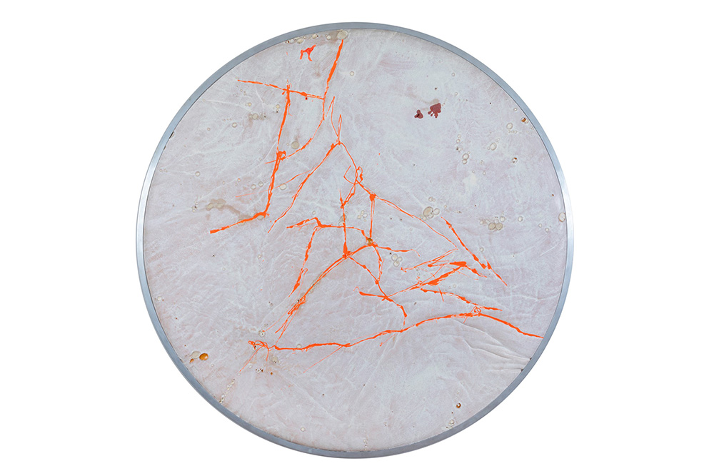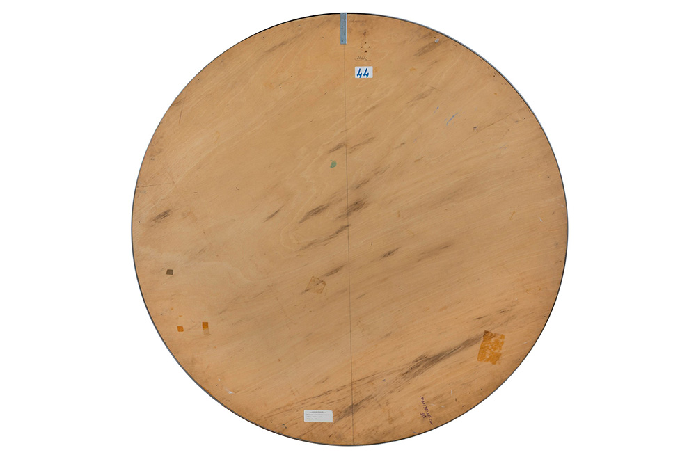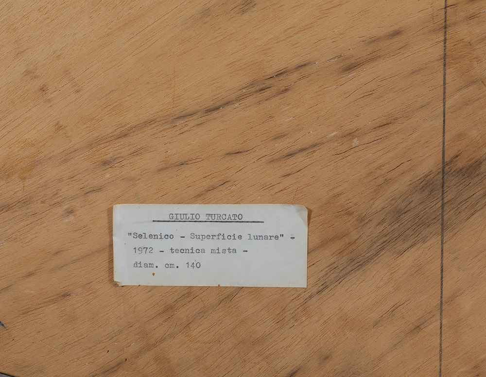 Giulio Turcato (1912-1995), Supeficie lunare, 1970 olio e tecnica mista su gommapiuma applicata su tavola, diametro cm 136 Opera registrata presso l’Archivio Giulio Turcato, Roma, con il n. 1062138125 Esposizioni: Galleria Editalia, Roma, Giulio Turcato, Febbraio 1972, non ill. Turcato, XVI Festival dei due mondi di Spoleto, Palazzo Ancaiani, giugno-luglio 1973 Bibliografia: Turcato, XVI Festival dei due mondi di Spoleto, Palazzo Ancaiani, giugno-luglio 1973, con testo di G. Carandente, a cura di Vana Caruso. Opera illustrata a p. 16 L’opera presenta alcune mancanze di colore, in alcuni crateri si è persa la materia ed il colore, altri presentano una decomposizione del colore, normale usura della materia nel tempo