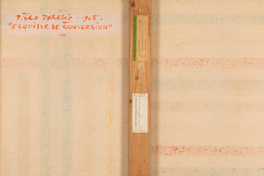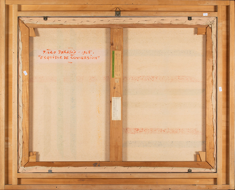 Piero Dorazio (1927-2005), Esquisse de Conversion, 1965 olio su tela, cm 73x92 firmato, datato e intitolato al retro Etichetta al retro della Galleria Marlborough, Roma Etichetta della data della mostra presso la Galleria Marlborough, Roma novembre 1968 Etichetta al retro “Nove maestri della pittura contemporanea” della Galleria Lorenzelli, Bergamo Timbro al retro della Galleria Lorenzelli, Bergamo Esposizioni: Galleria Marlborough, Roma, 1968 Nove Maestri della pittura contemporanea, Galleria Lorenzelli, Bergamo, 1973 Bibliografia: Nove maestri della pittura contemporanea, Galleria Lorenzelli, Bergamo, 1973. Citato in catalogo con il n.1 fra le opere dell’artista presenti in mostra Giorgio Crisafi, Jacques Lassaigne, Marisa Volpi Orlandini, Dorazio, Alfieri Edizioni d’Arte, Venezia, 1977, n. 794, rip. in b/n L’opera presenta macchie di foxing diffuse in corrispondenza dei bordi del telaio, ha una leggera patina di sporco in prossimità dei bordi