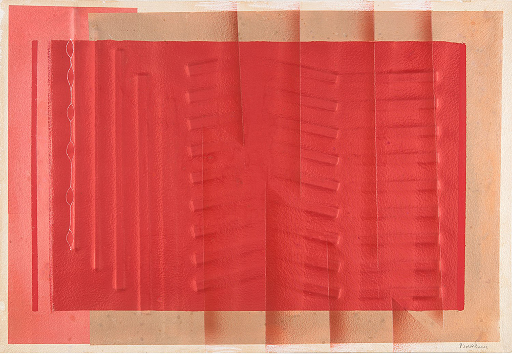 Agostino Bonalumi (1935-2013), Rosso, 1987, carta estroflessa e tecnica mista applicata su tela, cm 65x94 Firmato in basso a destra: Bonalumi Collezione privata. Milano, Galleria Arte 92, Agostino Bonalumi, mostra personale, 4 febbraio-24 aprile 2010. C. Cerritelli, Agostino Bonalumi, catalogo della mostra, 2010, Edizioni Galleria Arte, pp. 44-45 (riprodotto).