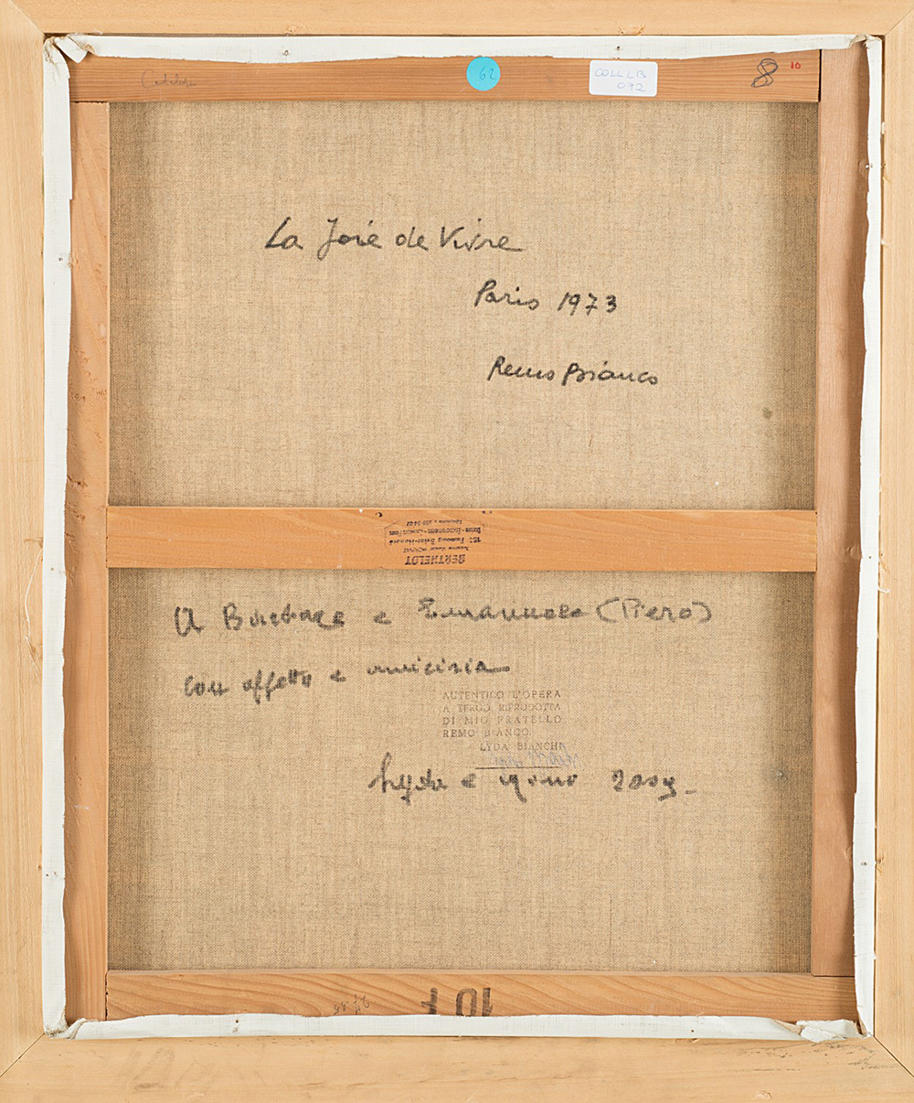 Remo Bianco (1922-1988), La joie de vivre, 1973, tecnica mista e foglia d'oro su tela, cm 56x46 Titolato, datato e firmato al verso: La joie de vivre Paris 1973 Remo Bianco Dedicato al verso Milano, collezione privata.