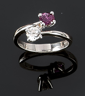 ANELLO Anello in oro bianco, modello contrarié, con rubino taglio cuscino di ct 0,60 e diamante taglio brillante rotondo di ct. 0,45 purezza VVS2, colore G-H Peso gr. 4,5 Certificato di analisi R.A.G. n. D048mn/11N rilasciato in data 16/09/2011