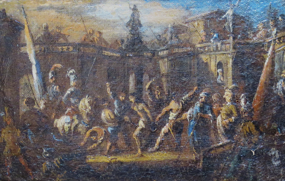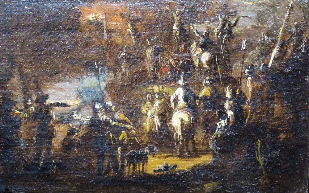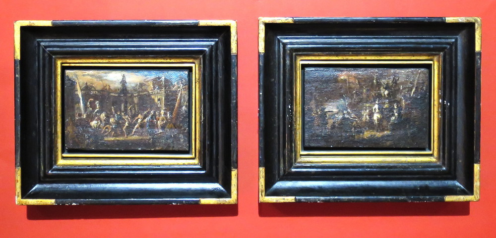 MICCO SPADARO, Micco Spadaro (1610/1675) attr. Coppia dipinti olio su tela raff. "Flagellazione" e "Crocefissione" - cm 18 x 11.5 -